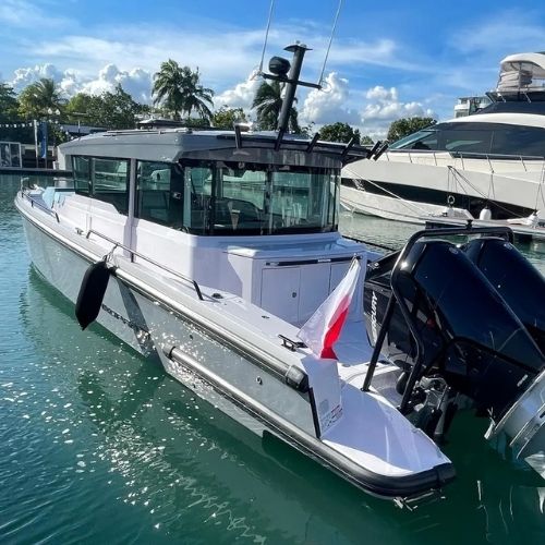 The flagship of our display. Fully optioned with electric sunroof, BRABUS Line styling, and twin 400 hp engines — a true all-weather performance cruiser with unmistakable presence on the water.