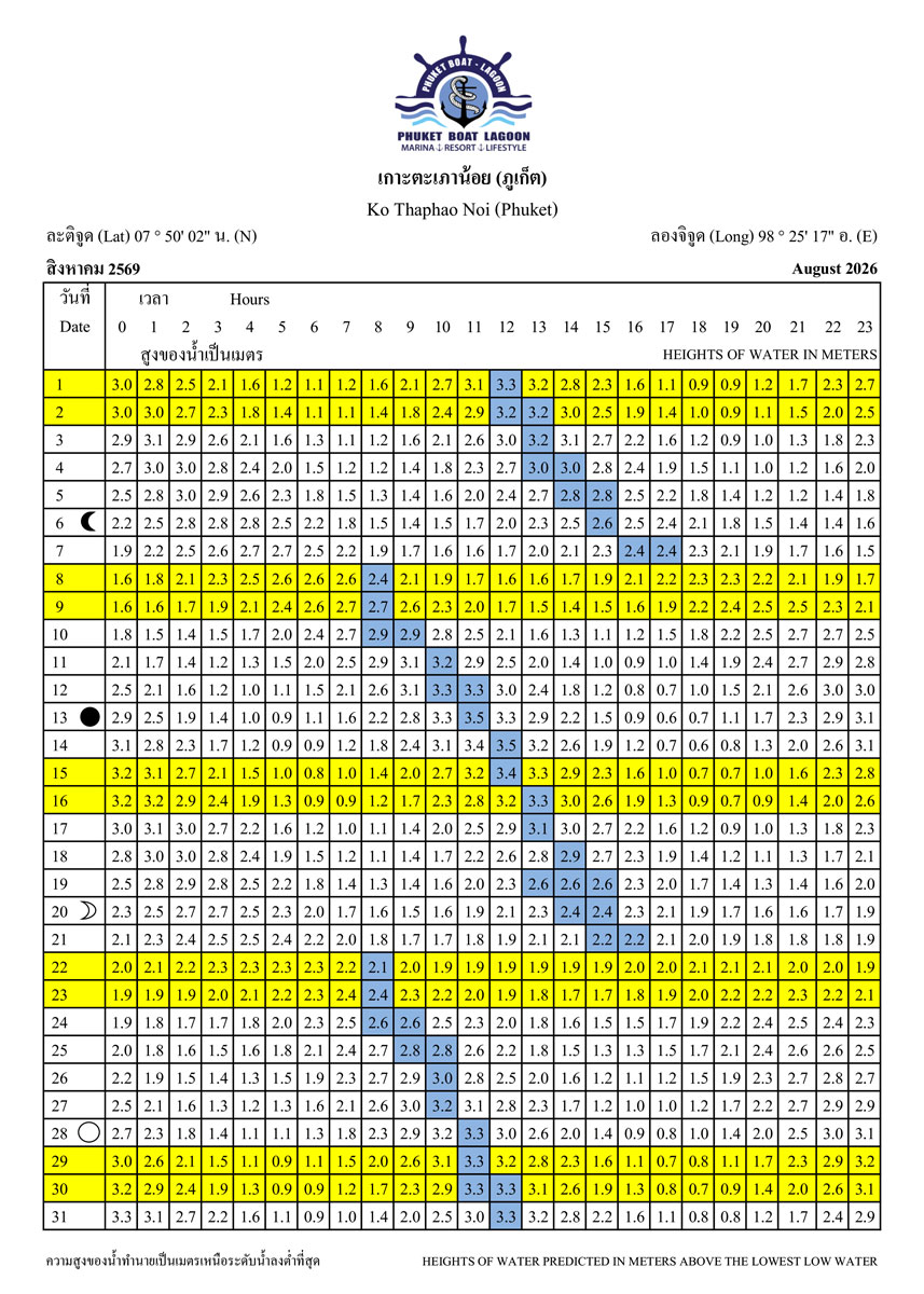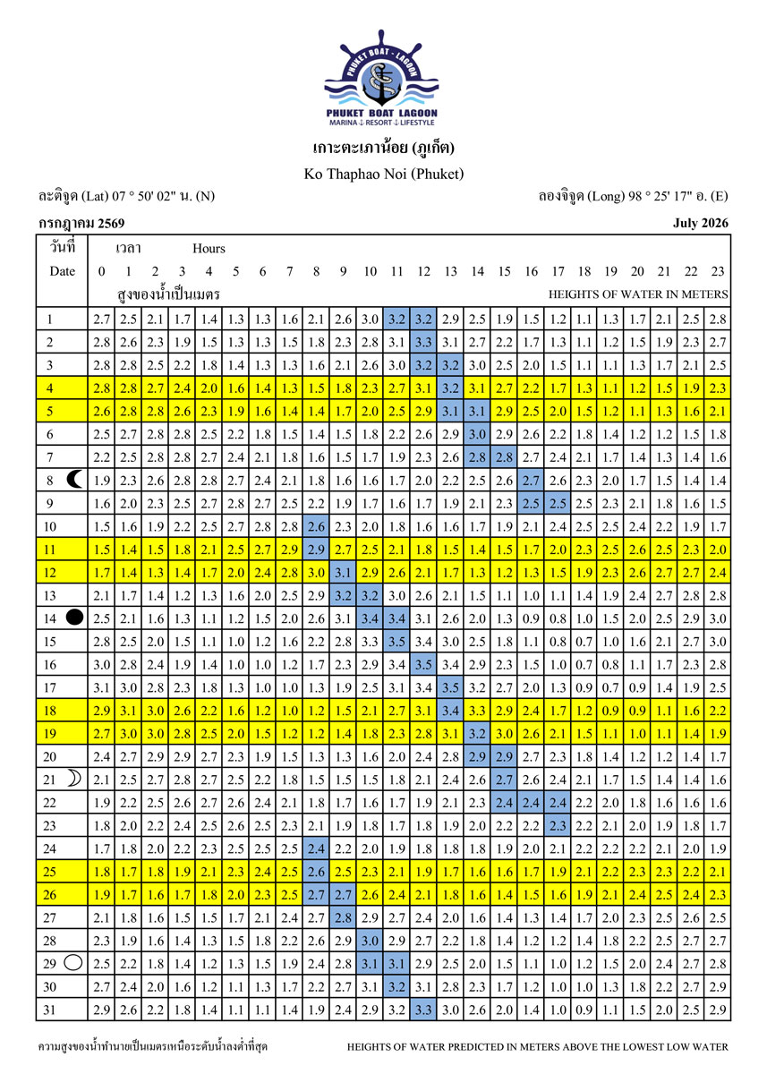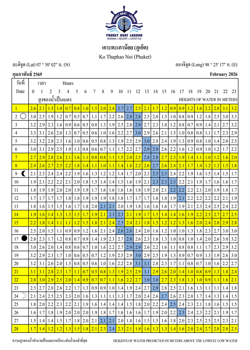 Our 2026 Phuket Tide Tables provide precise predictions to help you navigate safely in and out of marinas, anchorages, and moorings. Avoid low-tide bottlenecks and enjoy smooth sailing all year round.
