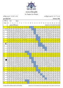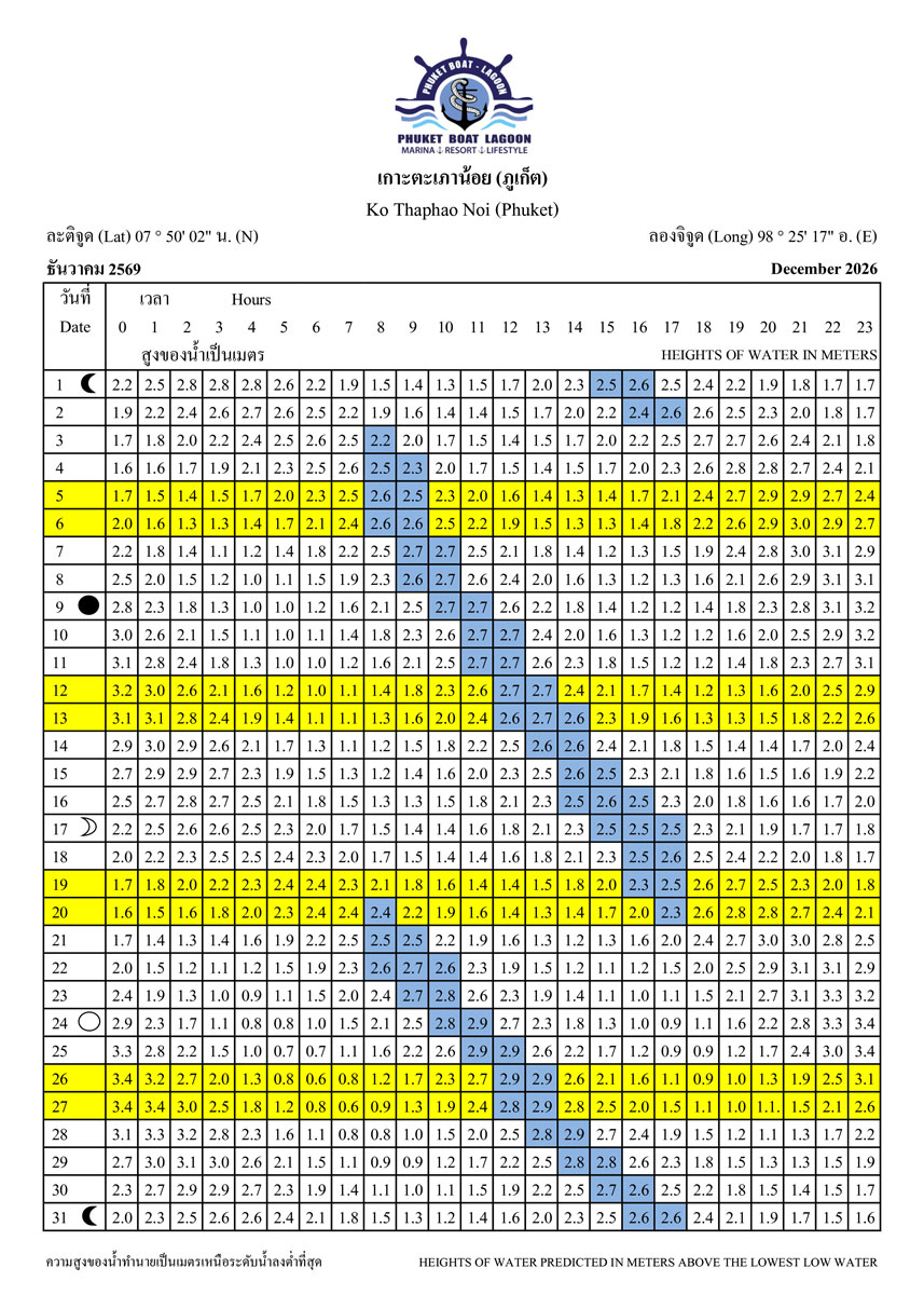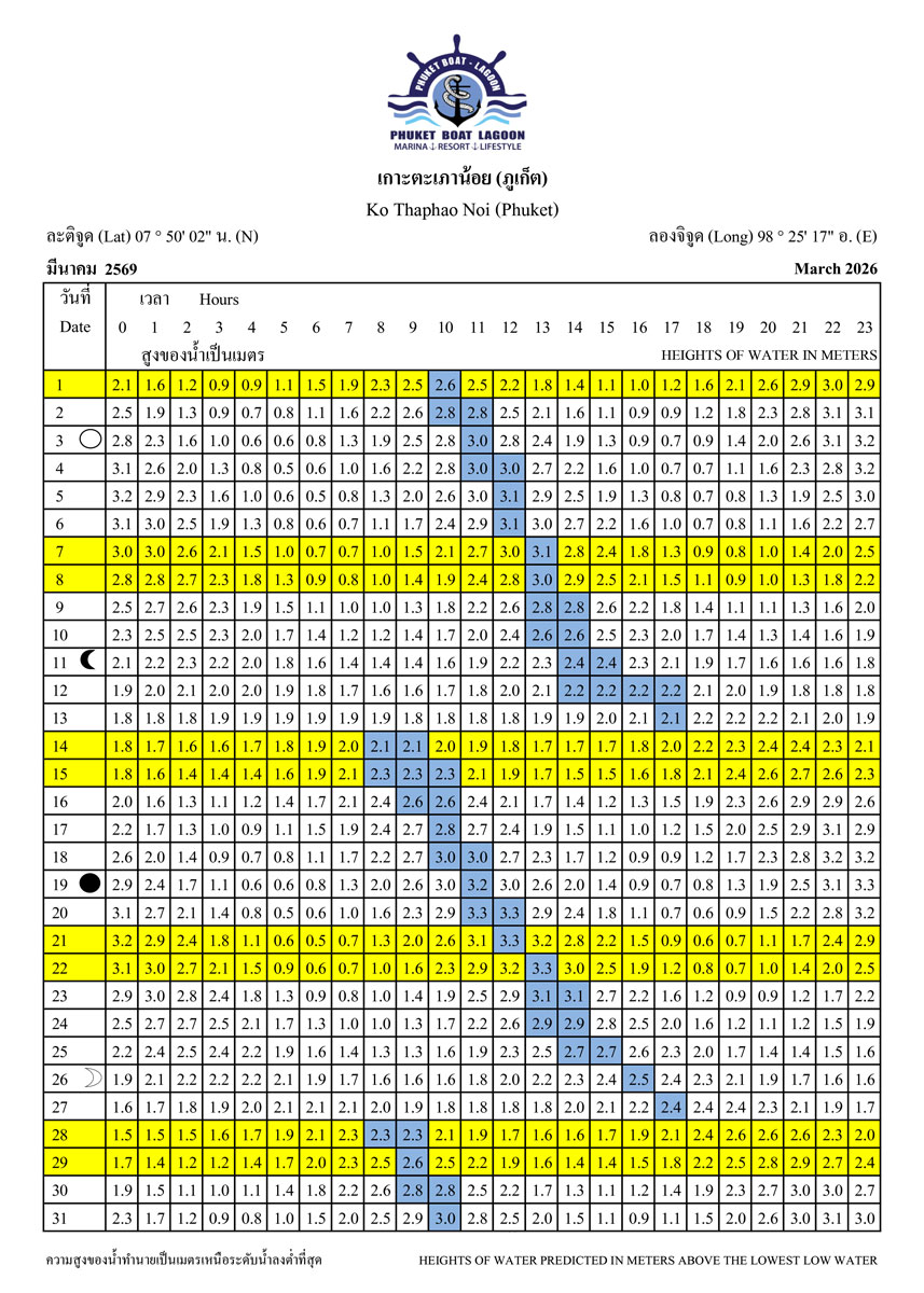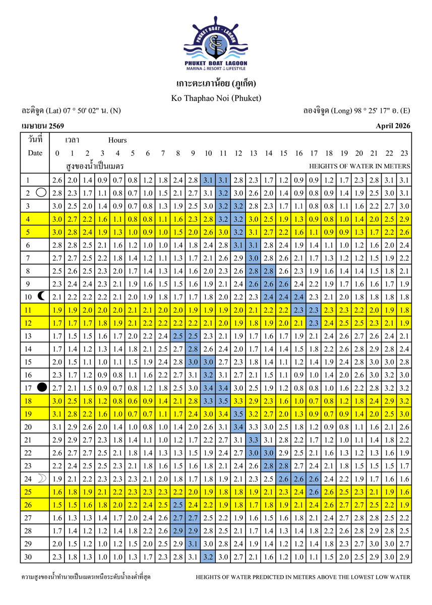 Tide Tables for 2026 at Koh Taphao Noi, Phuket. Predicted heights of water in meters above lowest low water.