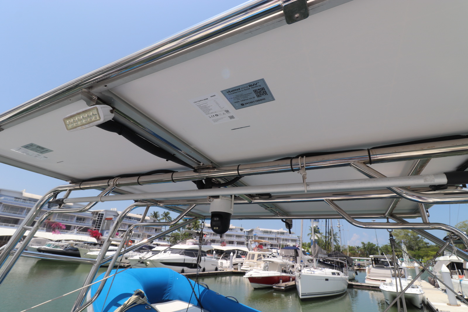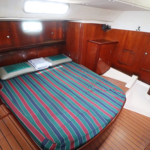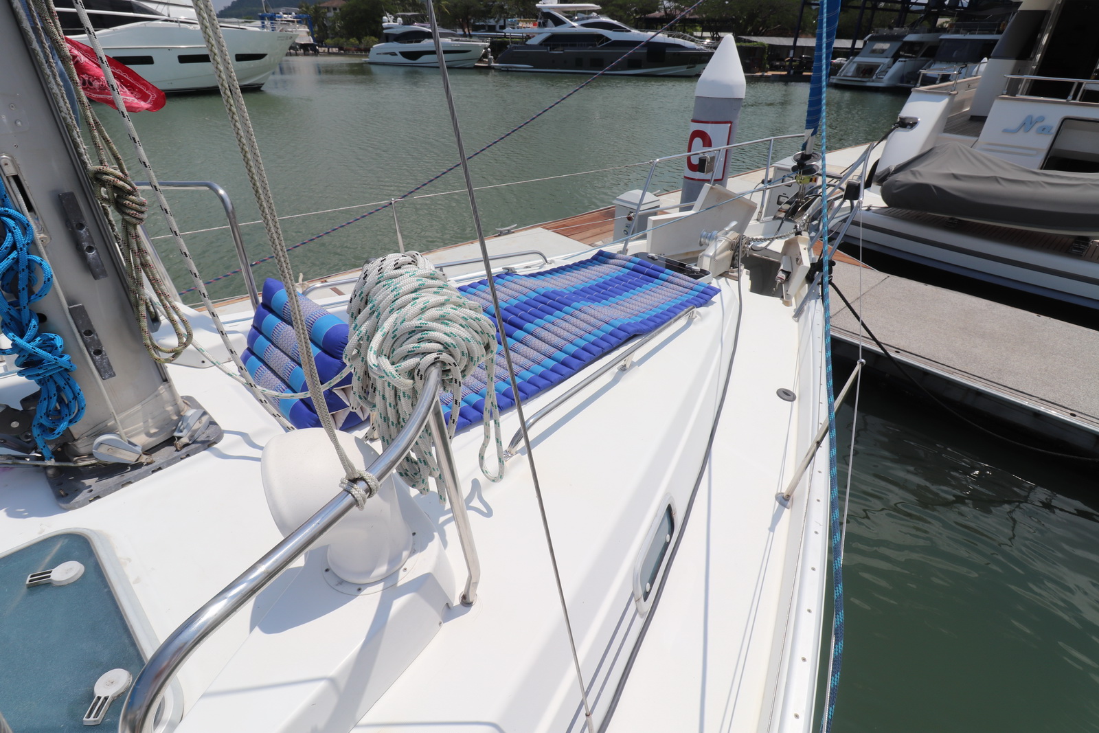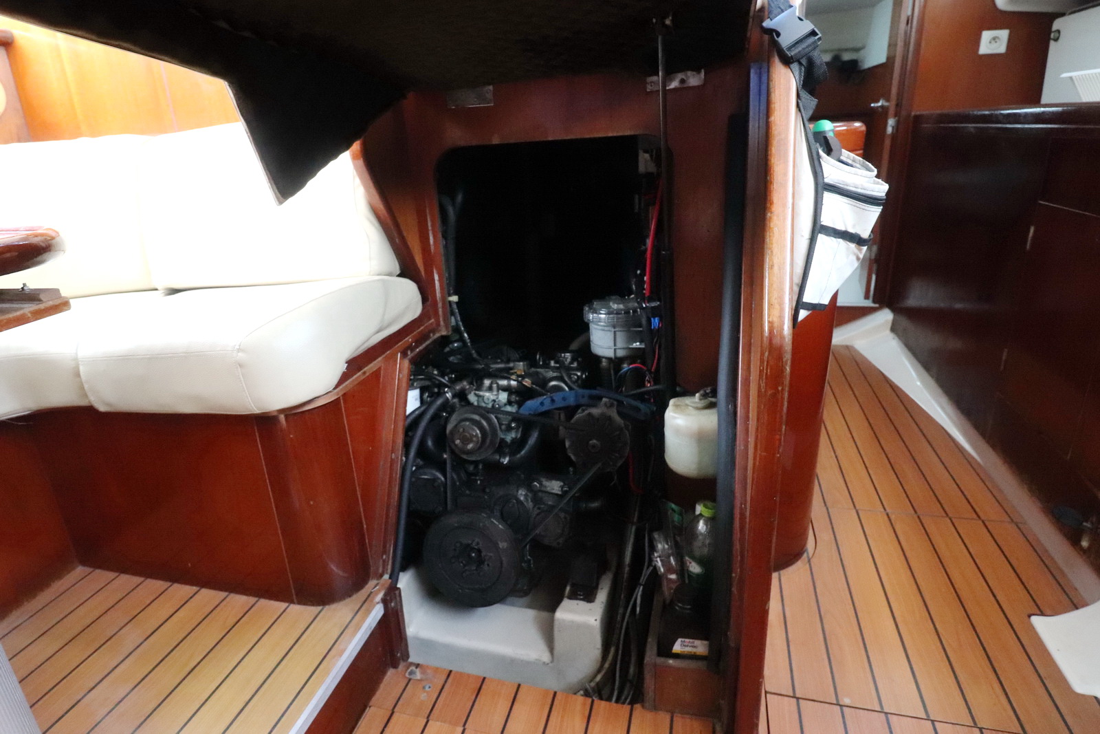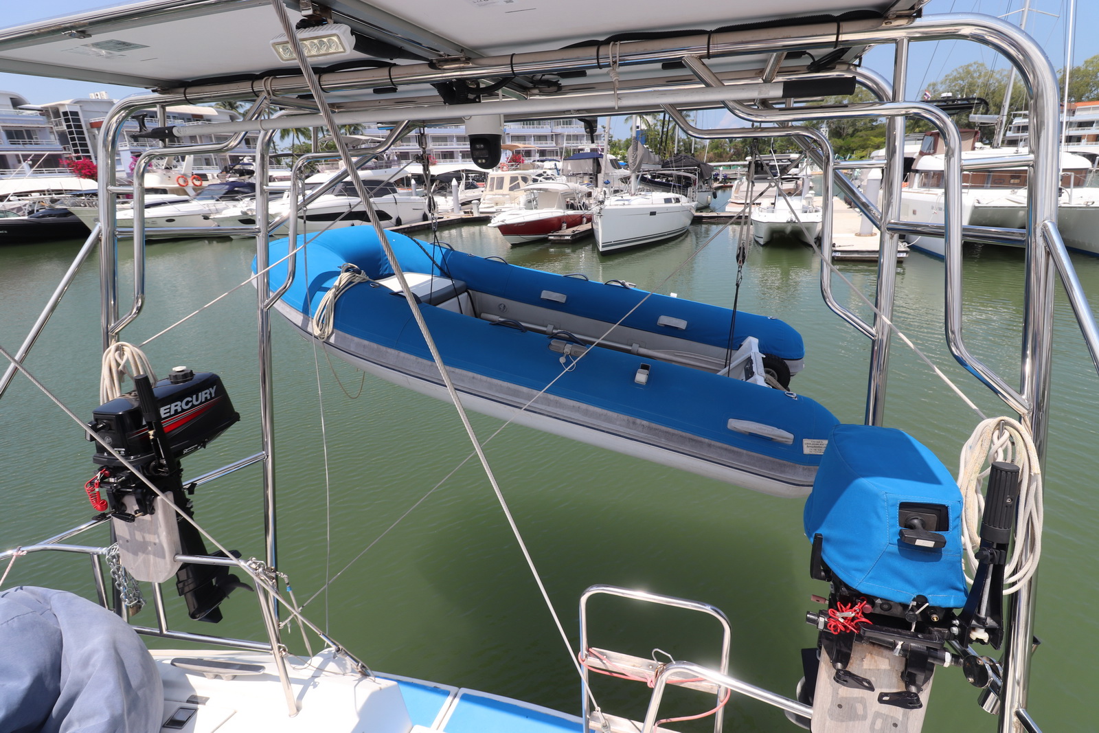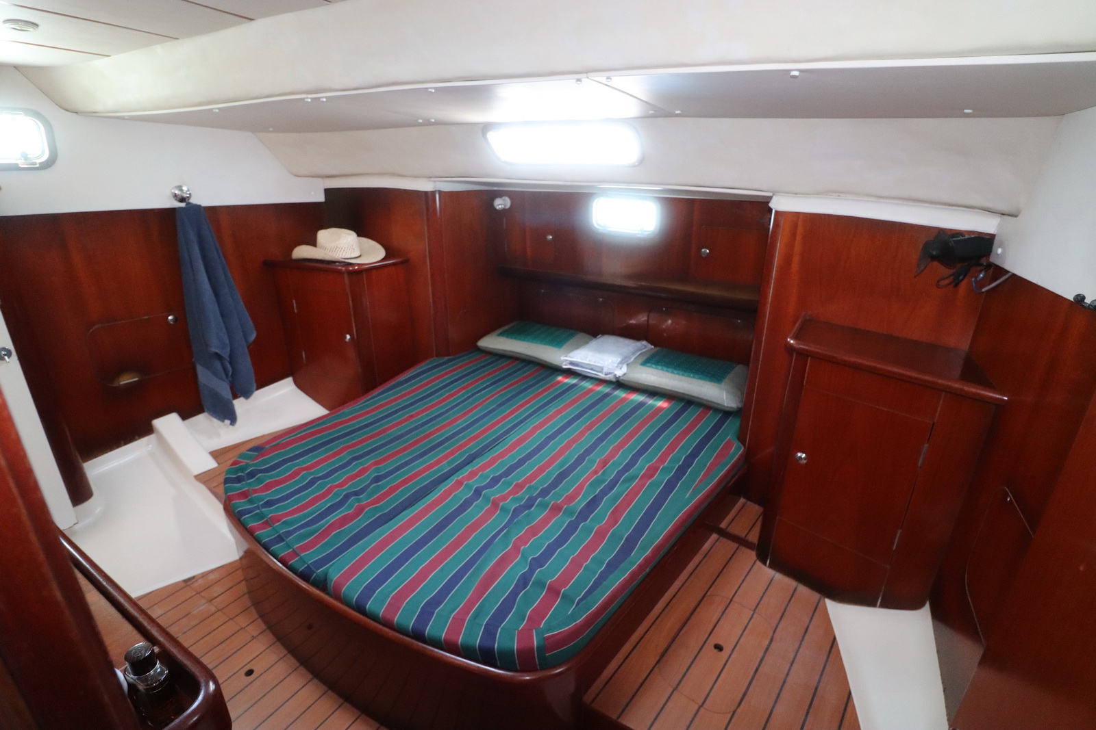 On deck there is a teak centre cockpit with comfortable U-shaped seating and a sugar-scoop stern with integrated swim platform and swim ladder. The large dinghy davit has solar panels above and storage for the two outboard engines, one 4 hp and one 15hp. The mainsail is in mast furling and the genoa is roller furling for ease of sail handling. There is excellent engine access to the 54 HP Yanmar engine via the companionway steps.