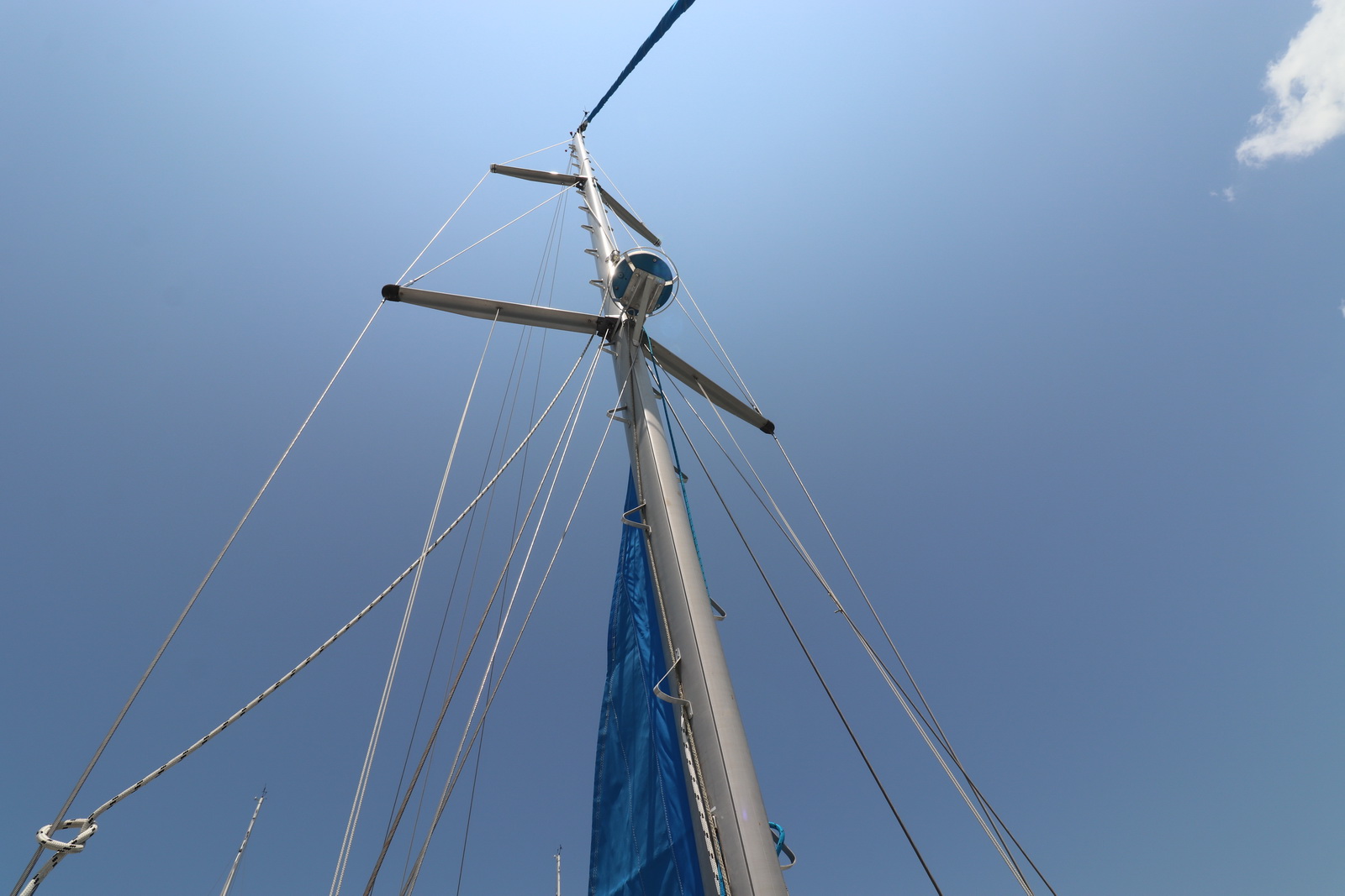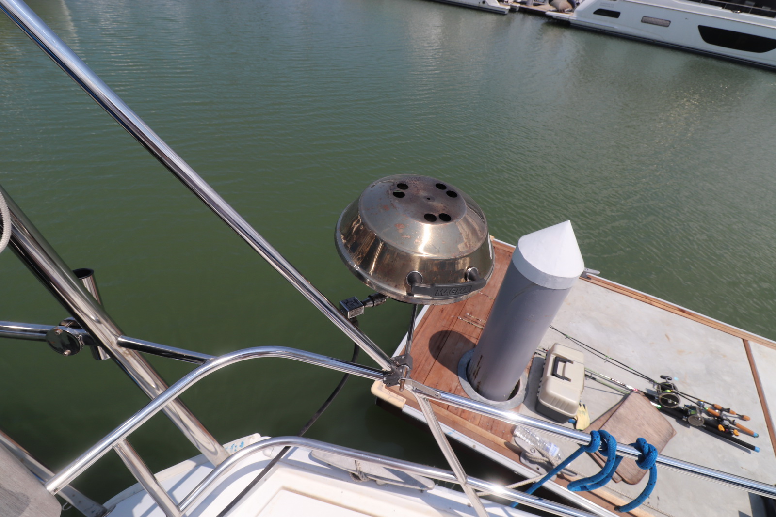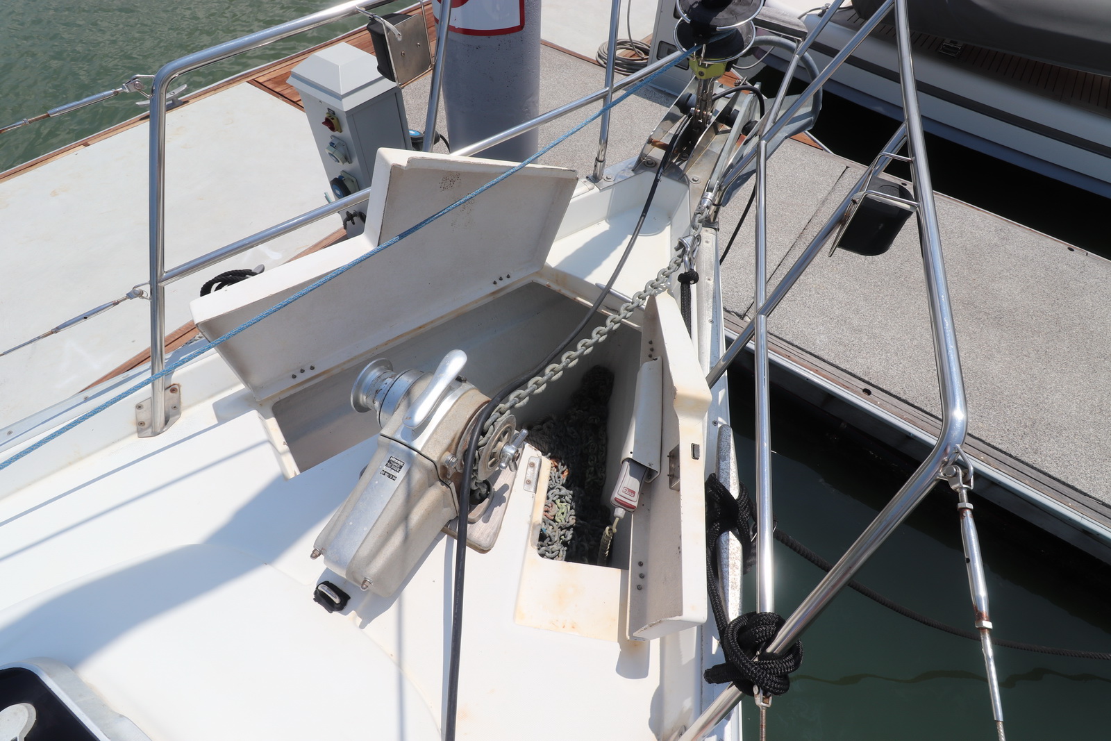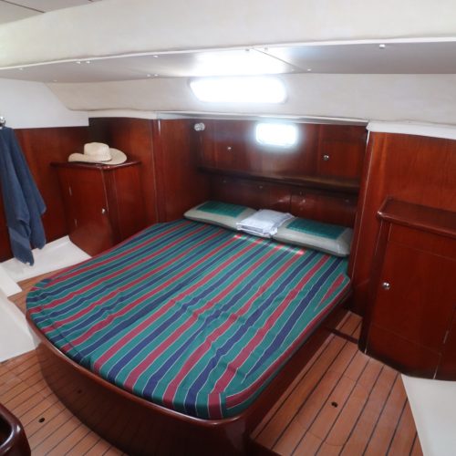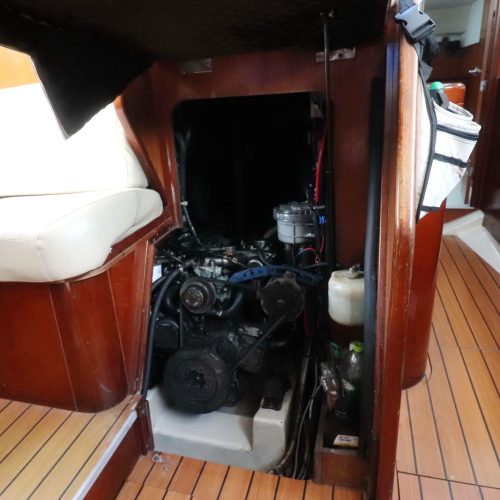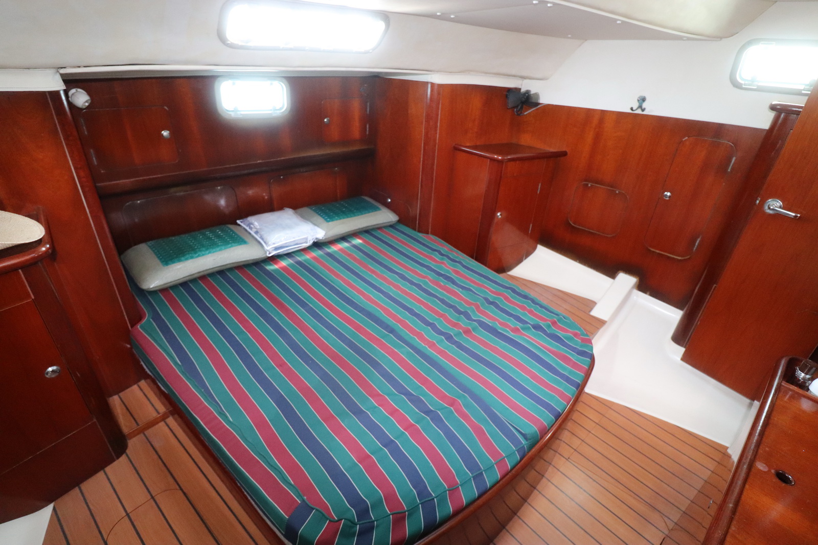 On deck there is a teak centre cockpit with comfortable U-shaped seating and a sugar-scoop stern with integrated swim platform and swim ladder. The large dinghy davit has solar panels above and storage for the two outboard engines, one 4 hp and one 15hp. The mainsail is in mast furling and the genoa is roller furling for ease of sail handling. There is excellent engine access to the 54 HP Yanmar engine via the companionway steps.