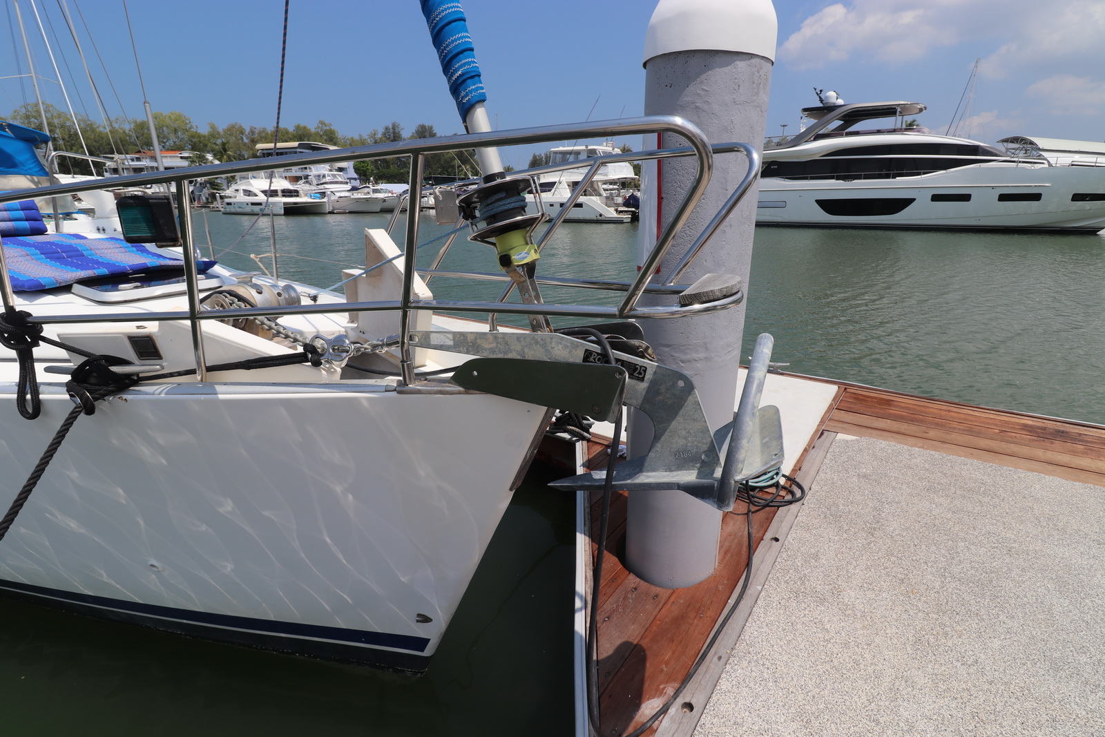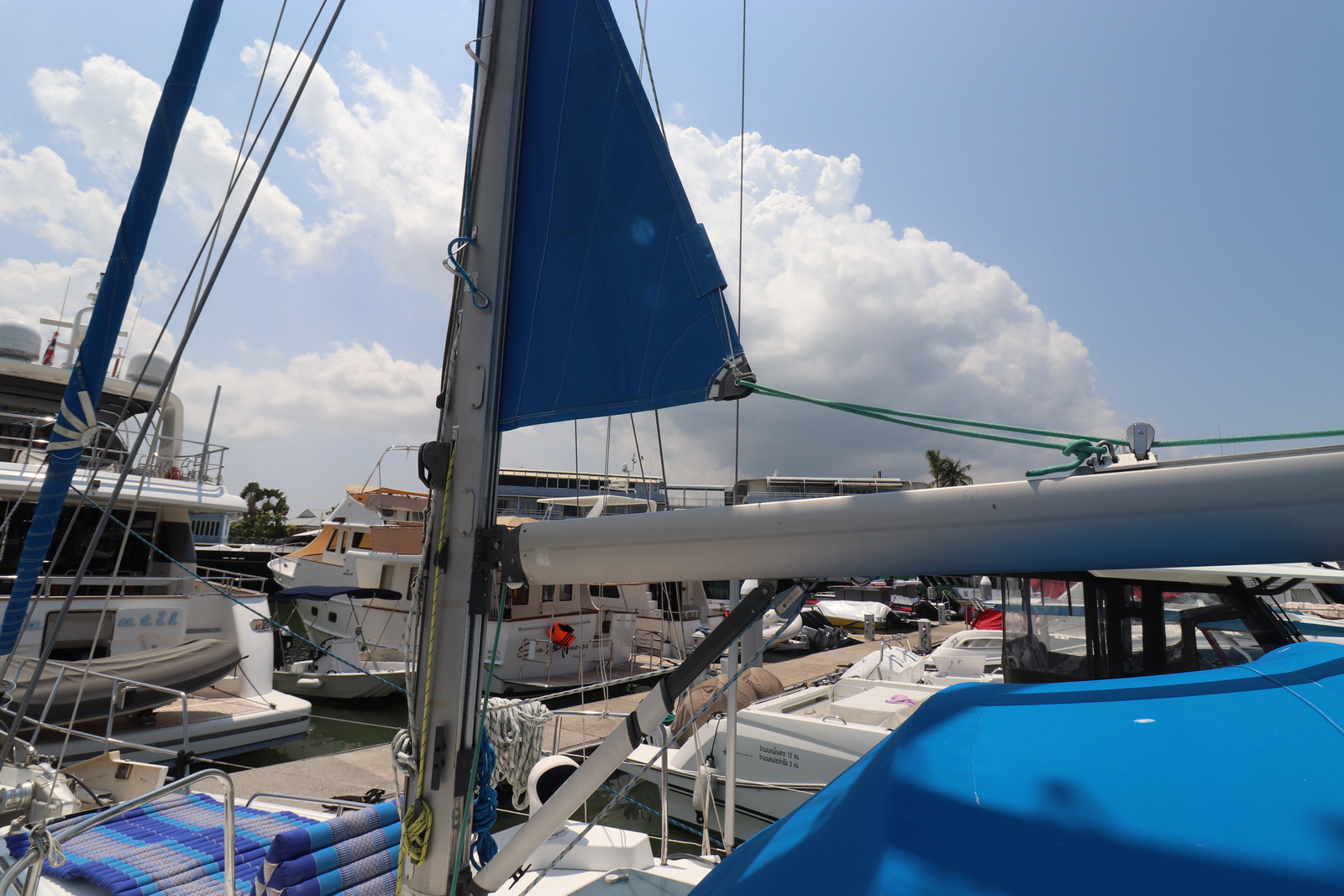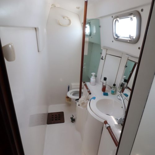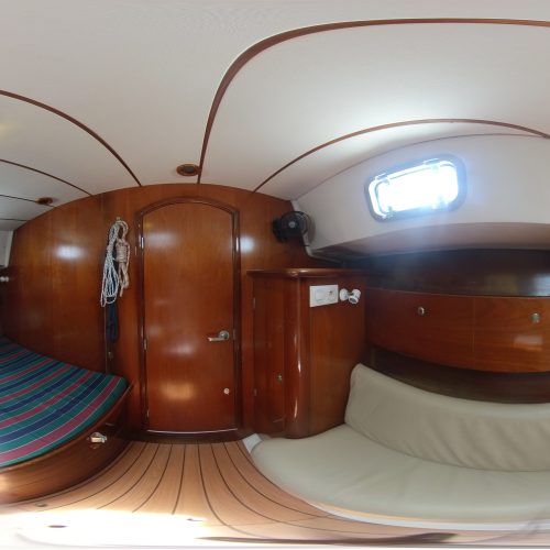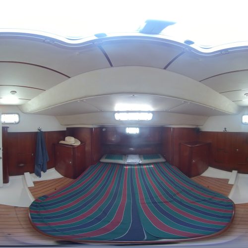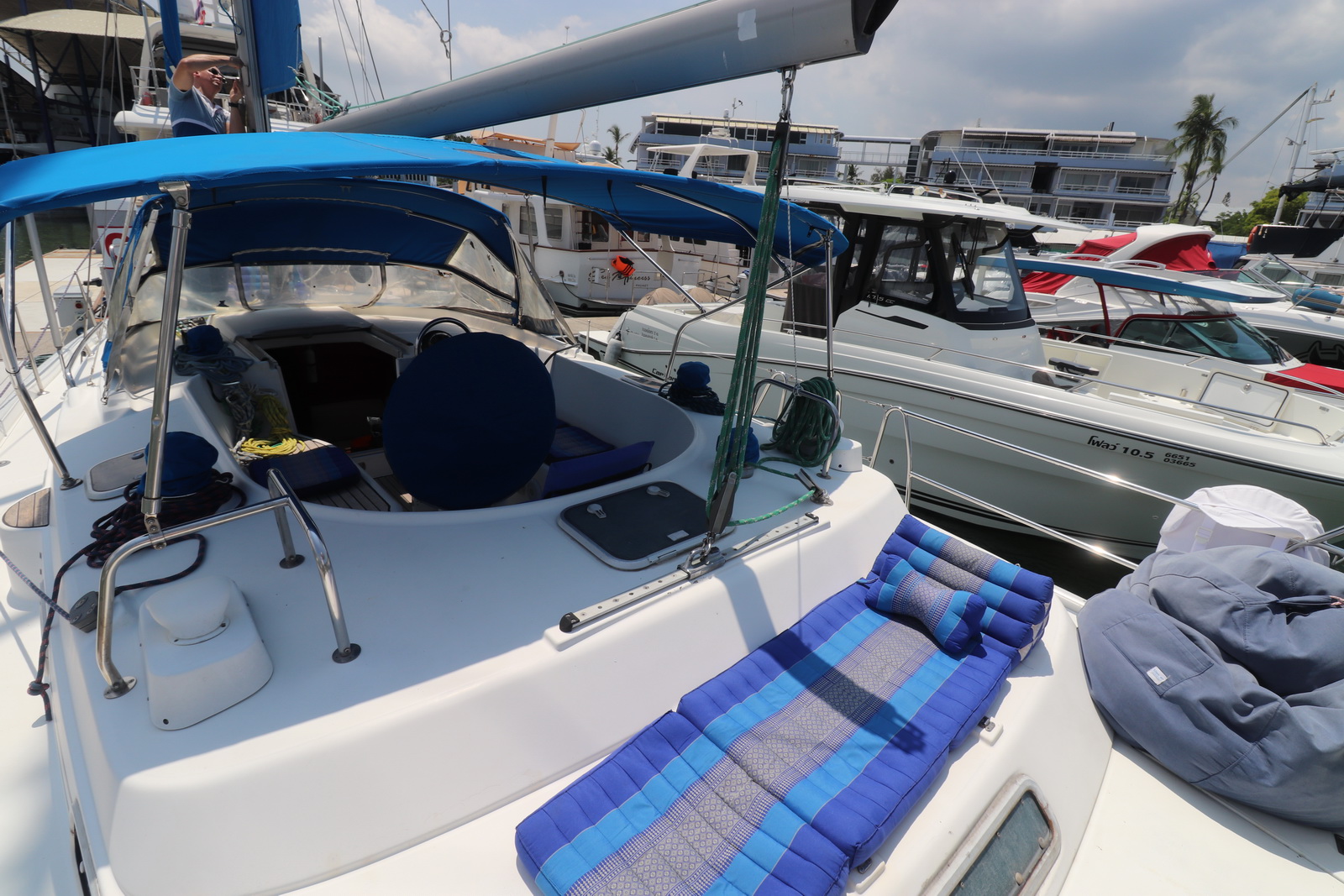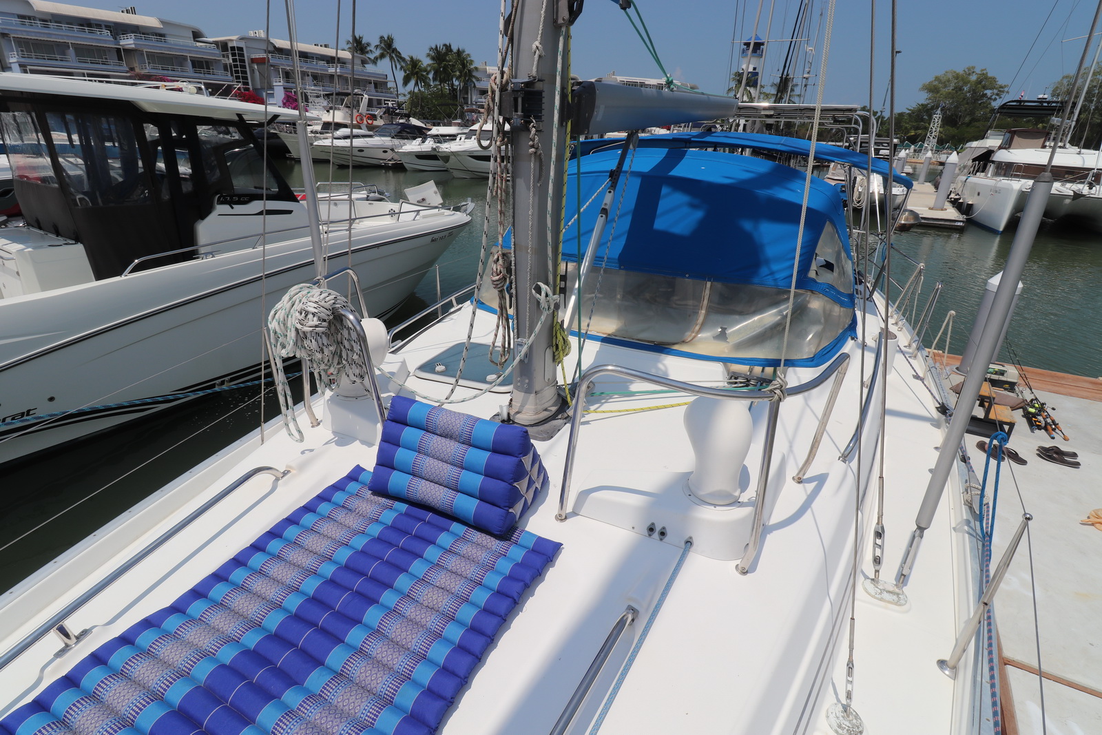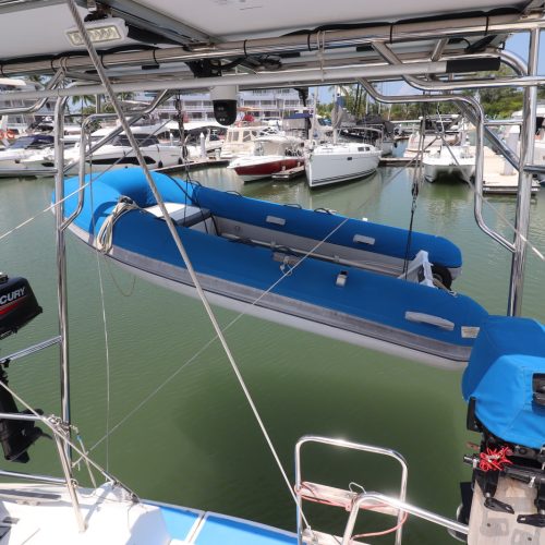 On deck there is a teak centre cockpit with comfortable U-shaped seating and a sugar-scoop stern with integrated swim platform and swim ladder. The large dinghy davit has solar panels above and storage for the two outboard engines, one 4 hp and one 15hp. The mainsail is in mast furling and the genoa is roller furling for ease of sail handling. There is excellent engine access to the 54 HP Yanmar engine via the companionway steps.