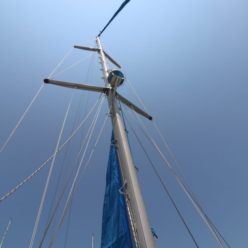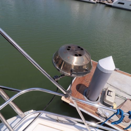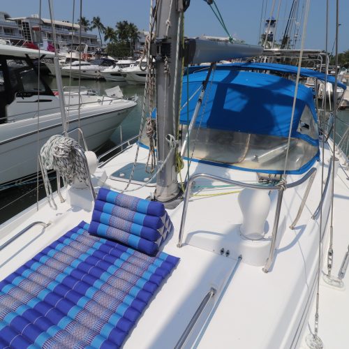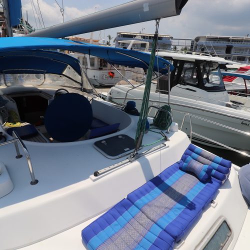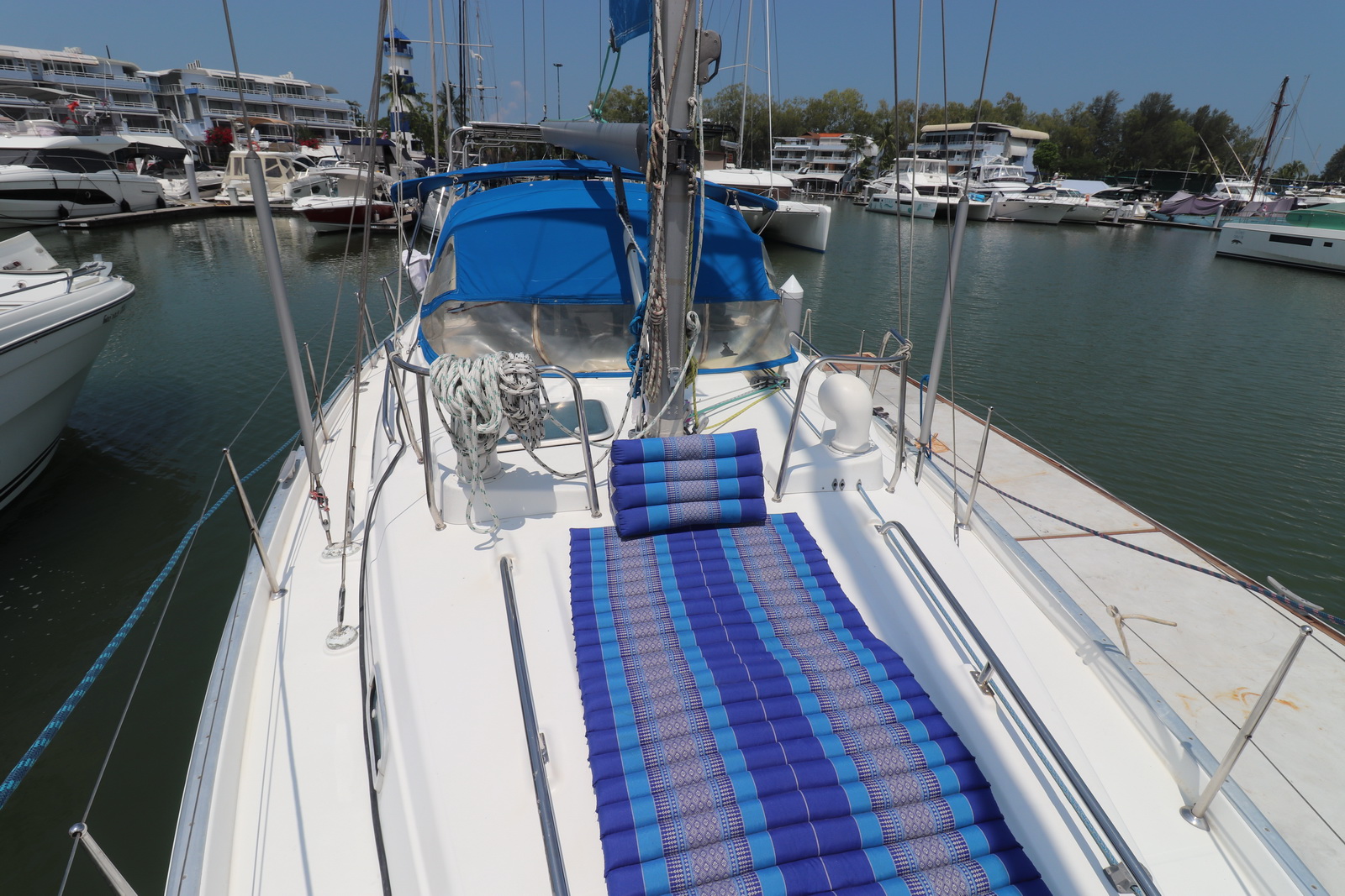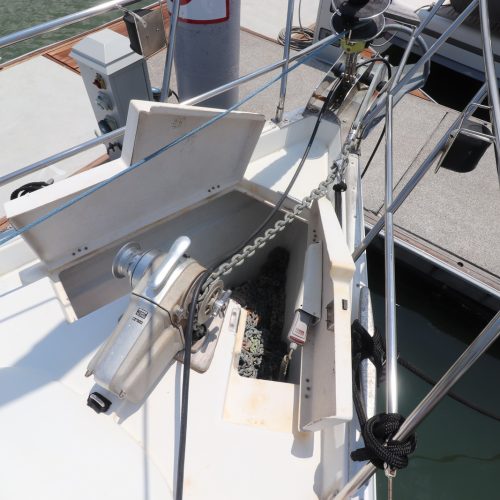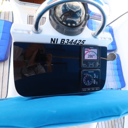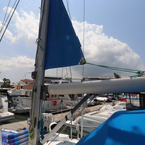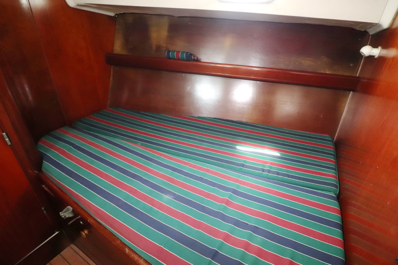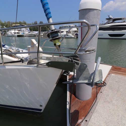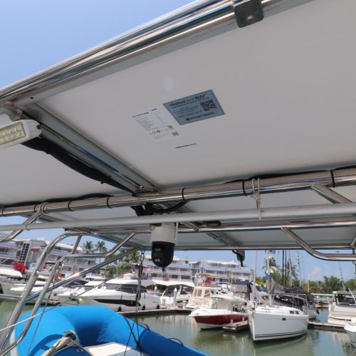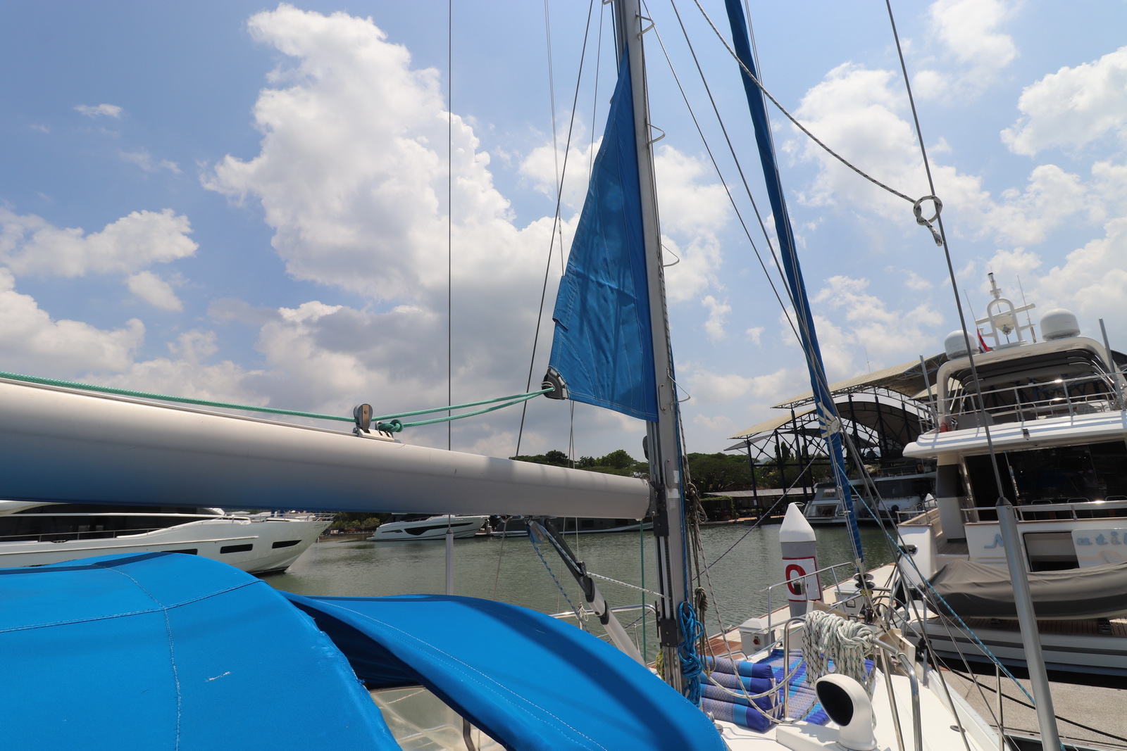 On deck there is a teak centre cockpit with comfortable U-shaped seating and a sugar-scoop stern with integrated swim platform and swim ladder. The large dinghy davit has solar panels above and storage for the two outboard engines, one 4 hp and one 15hp. The mainsail is in mast furling and the genoa is roller furling for ease of sail handling. There is excellent engine access to the 54 HP Yanmar engine via the companionway steps.