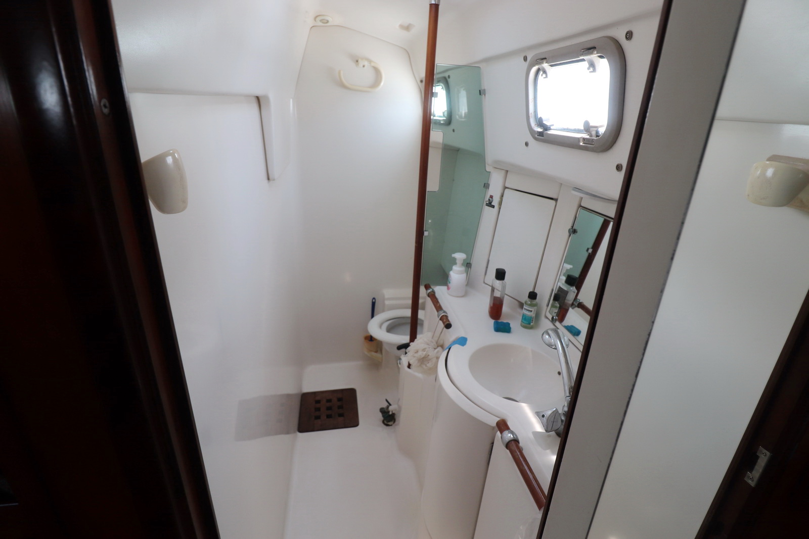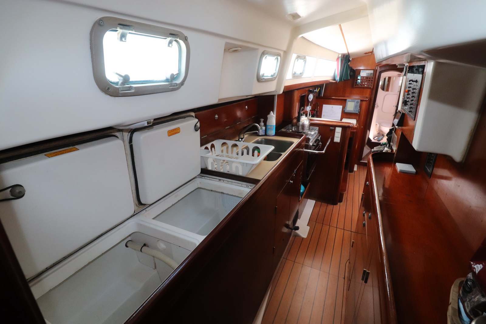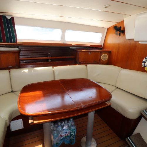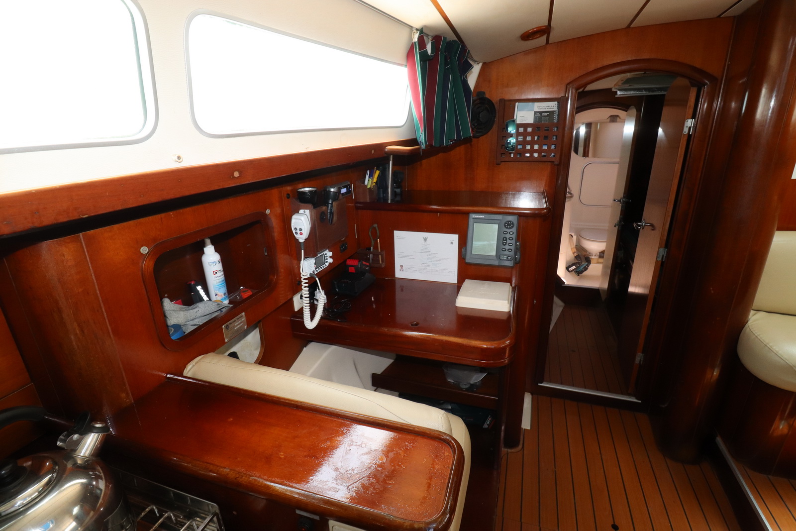 It has a spacious full-beam master cabin with a generous walkaround berth, ample storage, and an en-suite head with shower. There is a well-equipped linear galley located to port leading from the aft cabin to the saloon offering abundant work surfaces and storage. The saloon is bright and inviting with a U-shaped sofa to starboard with an expandable dining table, and excellent headroom. The forward guest cabin has a double berth to starboard with a seat and wardrobe storage to port and ensuite head with shower forward.