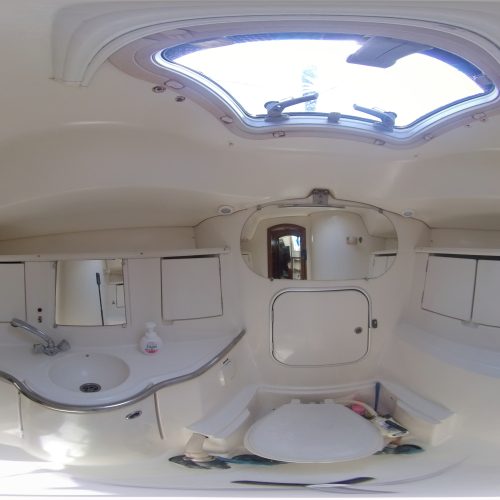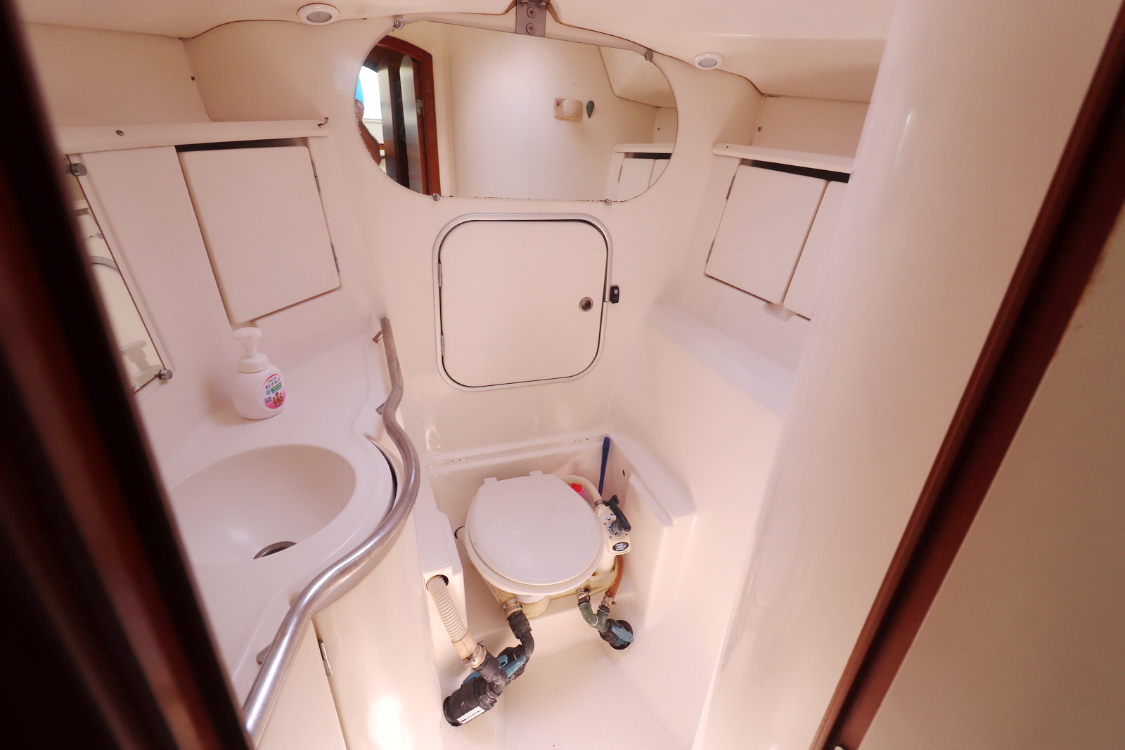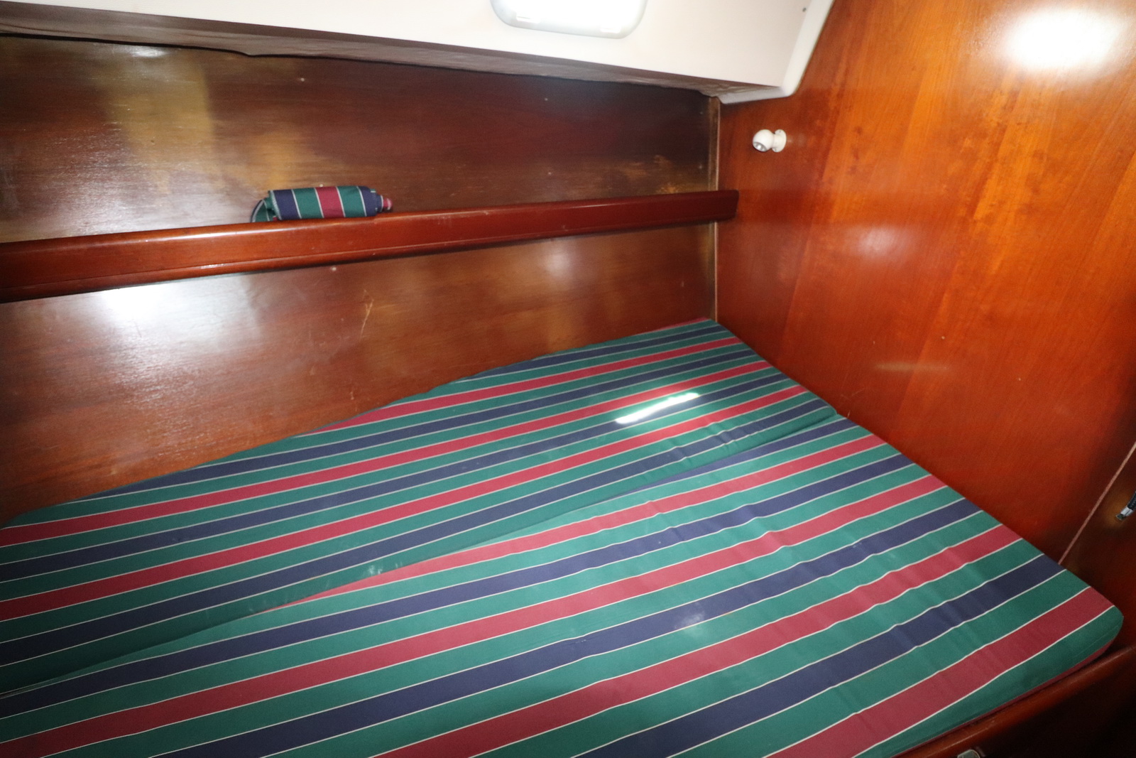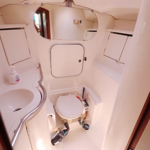 It has a spacious full-beam master cabin with a generous walkaround berth, ample storage, and an en-suite head with shower. There is a well-equipped linear galley located to port leading from the aft cabin to the saloon offering abundant work surfaces and storage. The saloon is bright and inviting with a U-shaped sofa to starboard with an expandable dining table, and excellent headroom. The forward guest cabin has a double berth to starboard with a seat and wardrobe storage to port and ensuite head with shower forward.