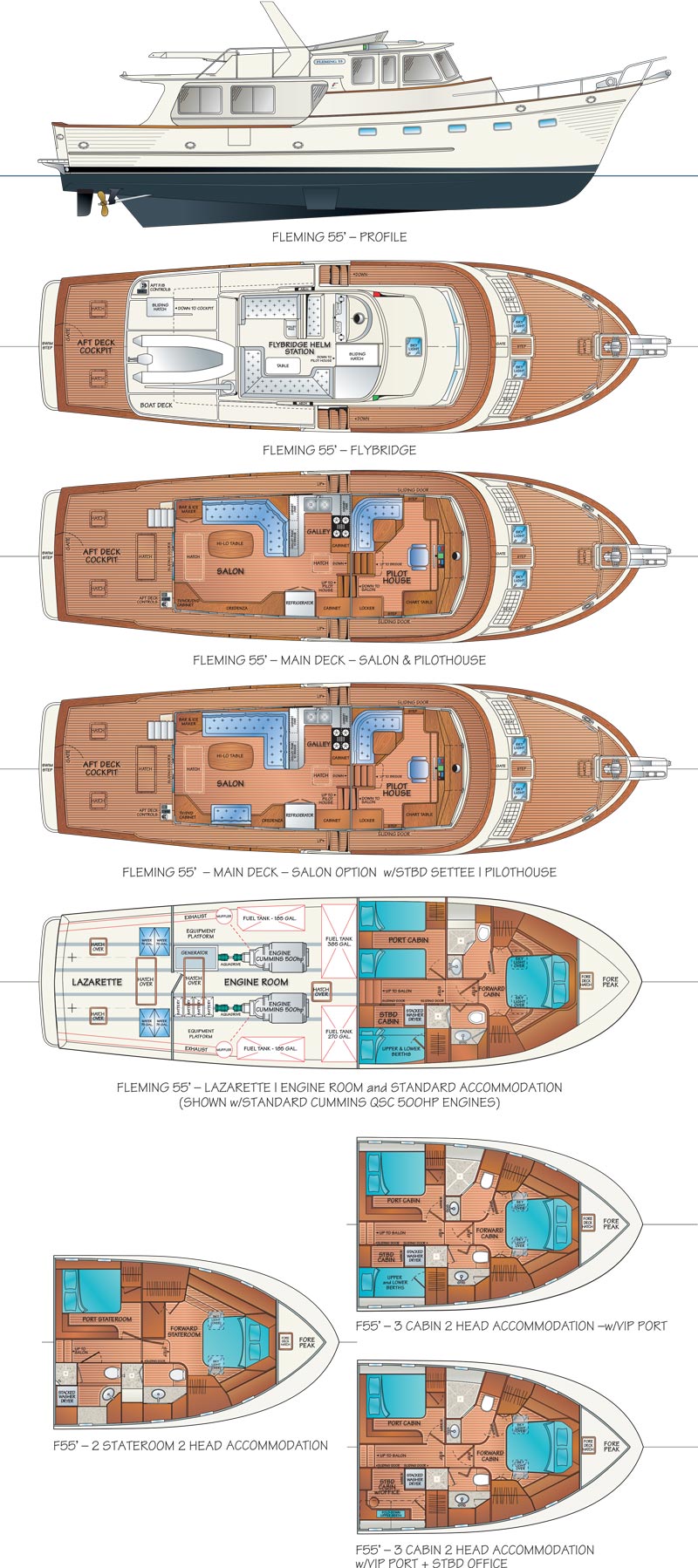 The Fleming 55 is a well-proven raised pilothouse motoryacht designed for serious cruising. Her semi-displacement hull gives her great flexibility in performance. The Fleming 55 has a range of 2,000 nautical miles at 8 knots yet, with her standard Twin Cummins QSC 500 hp common rail engines, she can attain a top speed of approximately 18 knots. Maximum sustained cruising speed is around 17 knots where her moderate deadrise provides a comfortable ride unlike those boats for which speed is the main design criteria. These high speed, planing hulls require flatter sections making for a hard ride and the need to slow down in a seaway.