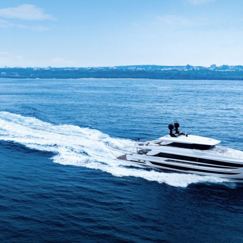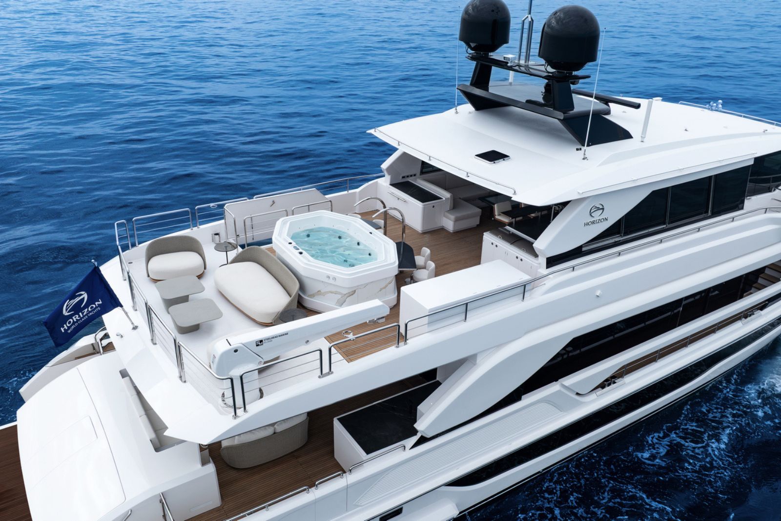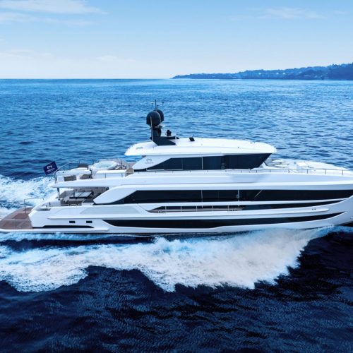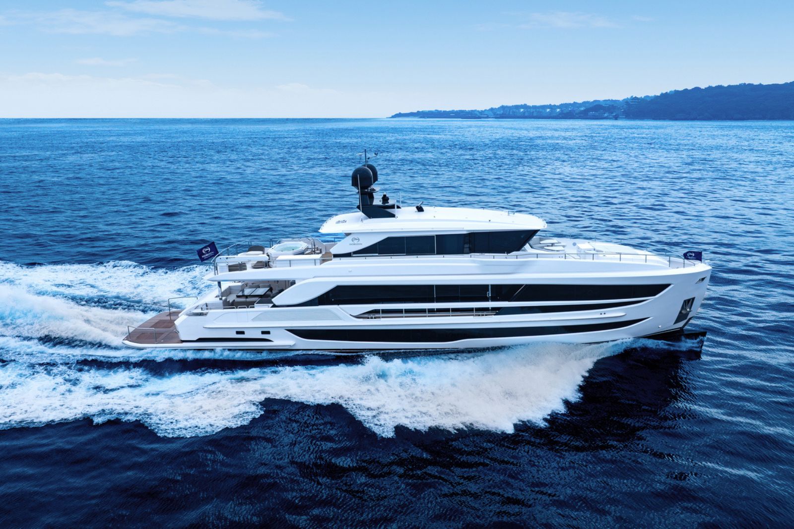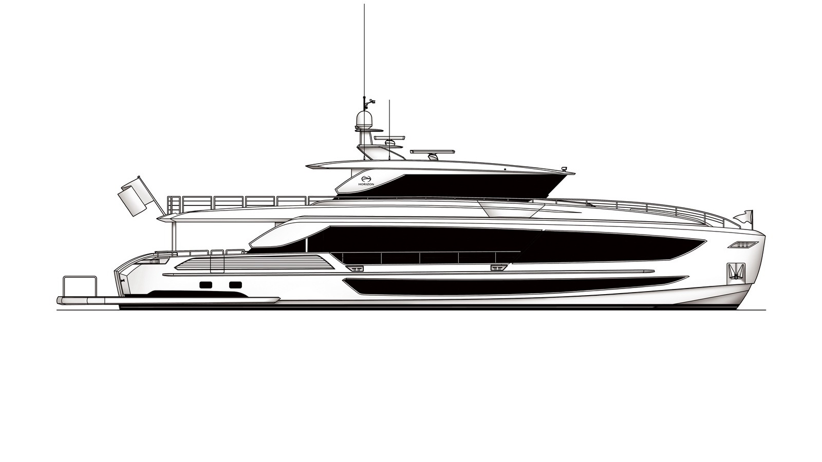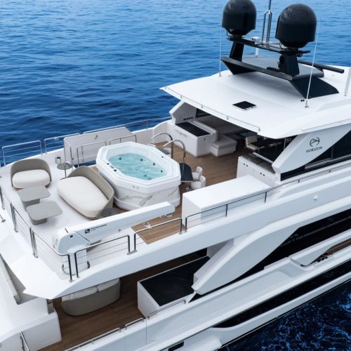 Horizon Yachts FD100 Skyline — a bold evolution of the acclaimed Fast Displacement Series, combining exceptional interior volume with a sleek Skyline configuration. Her striking exterior profile is defined by a sculpted silhouette and bespoke radar arch detailing that enhance the dynamic character of the FD platform while maintaining its signature balance and proportion. The result is a yacht that feels both powerful and refined.