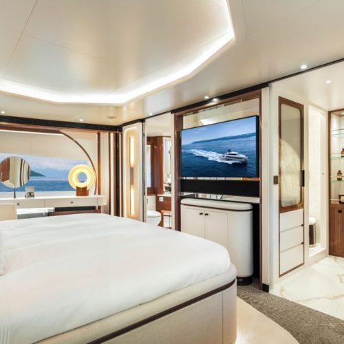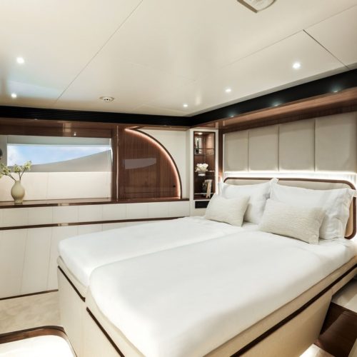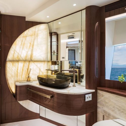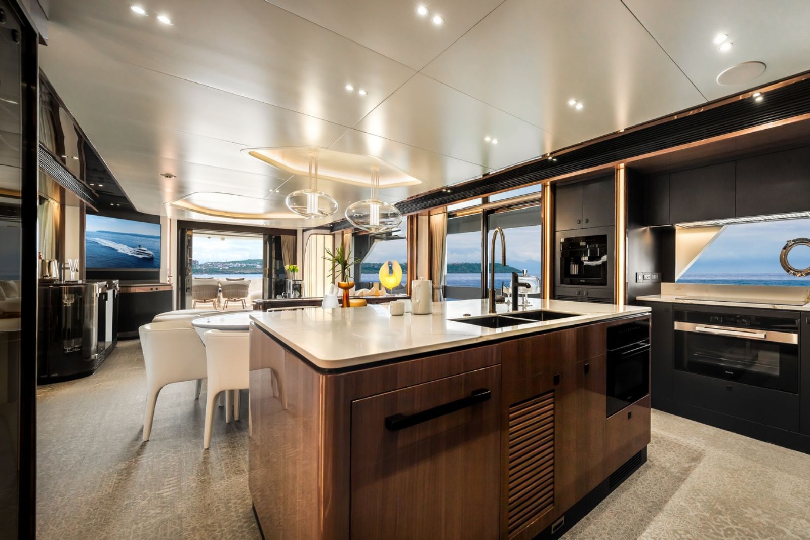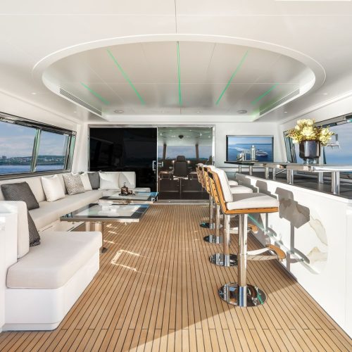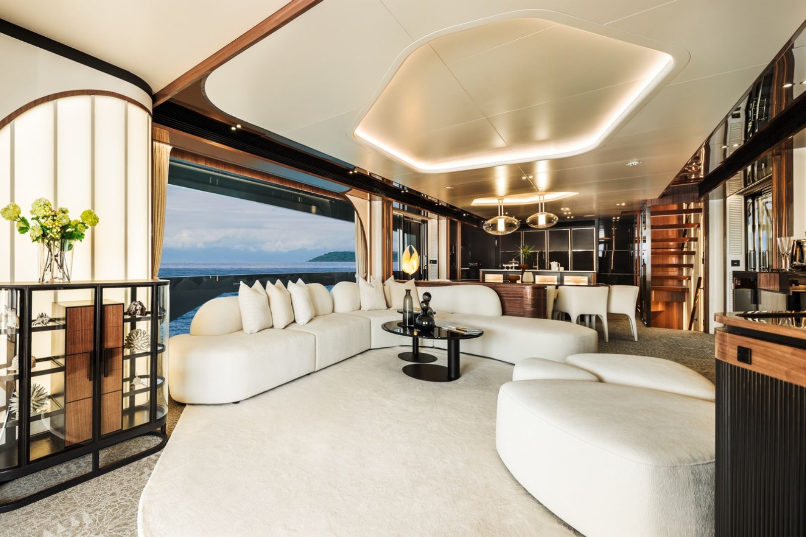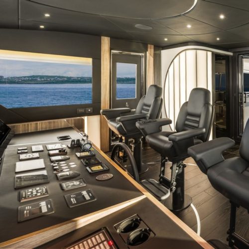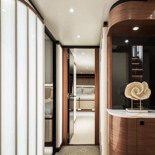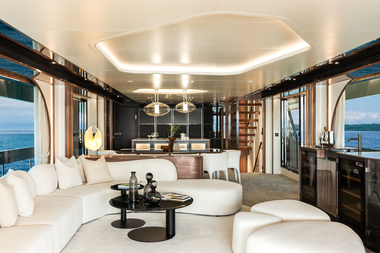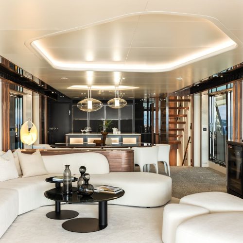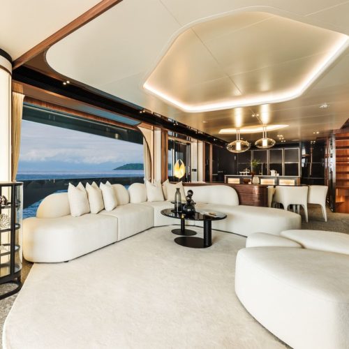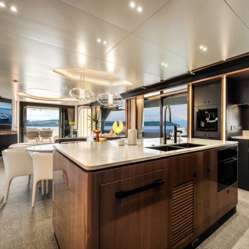High-gloss Koto wood contrasts with matte black and white lacquer finishes, while mirrored gunmetal titanium ceiling elements and brushed stainless accents introduce a layered, modern atmosphere. The FD100 Skyline also features the first Open Galley configuration on this model, designed as a luminous, social centerpiece enhanced by indirect LED lighting and expansive floor-to-ceiling glazing.