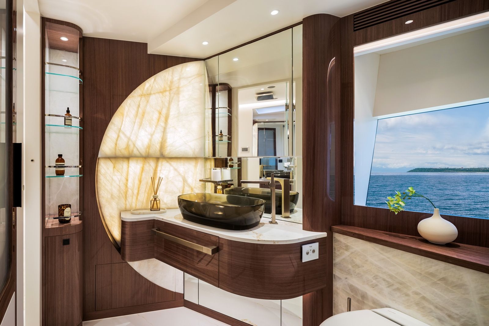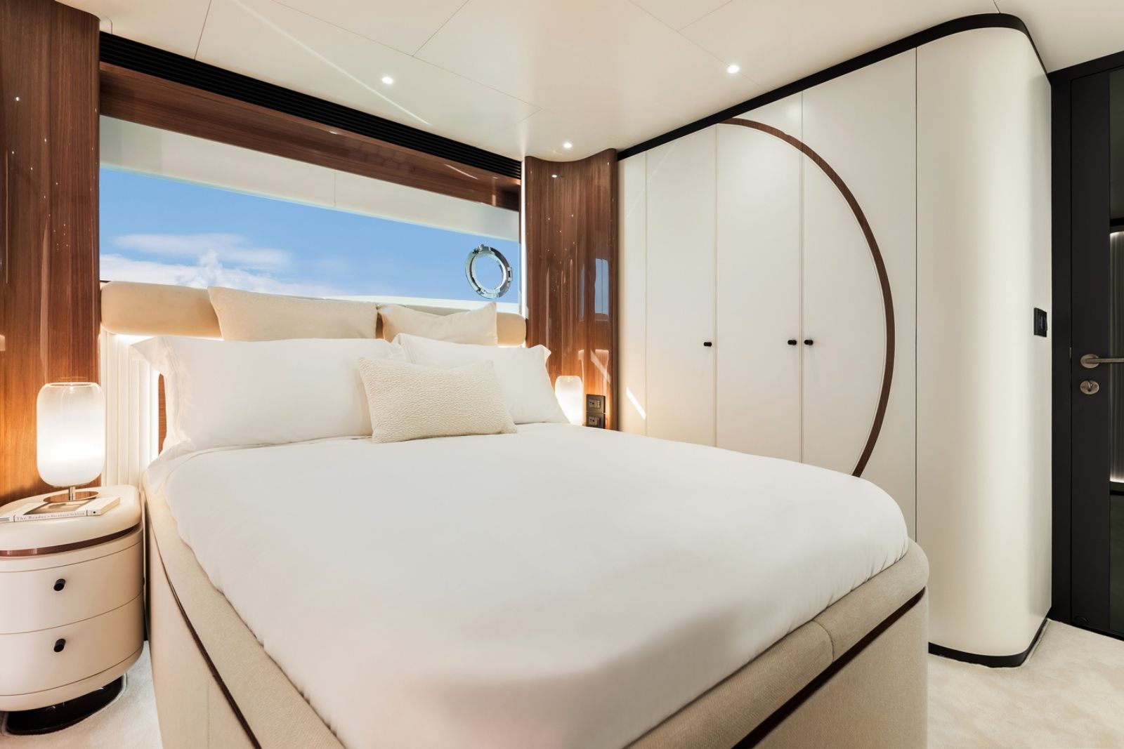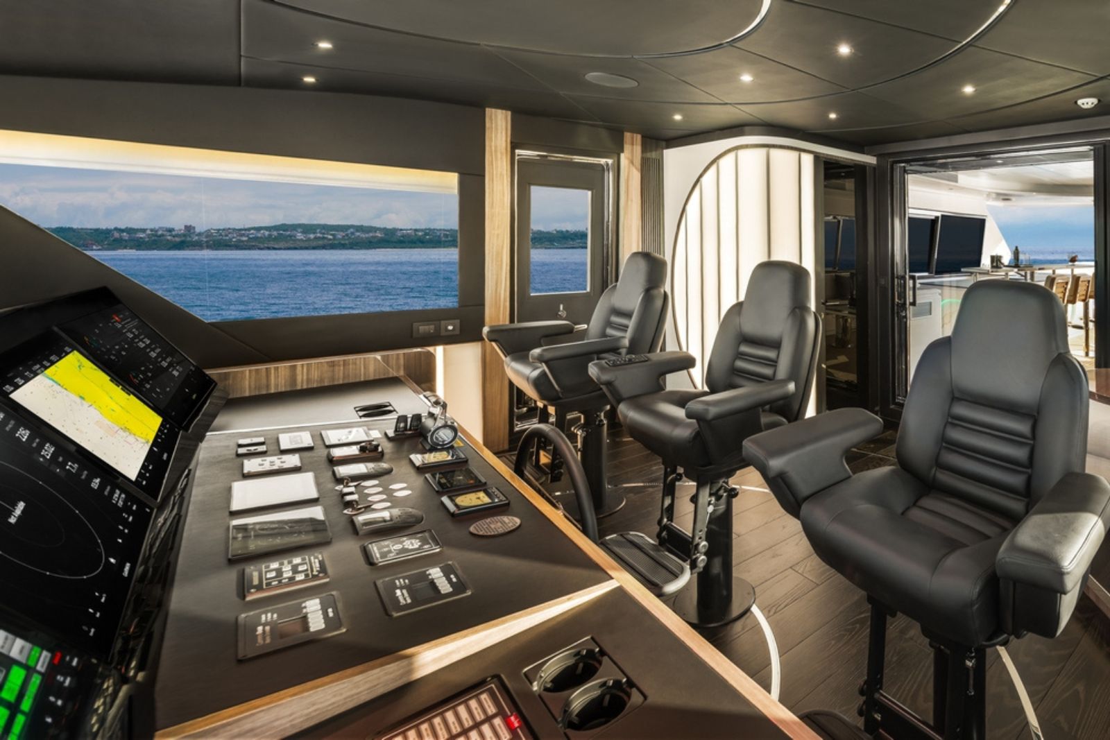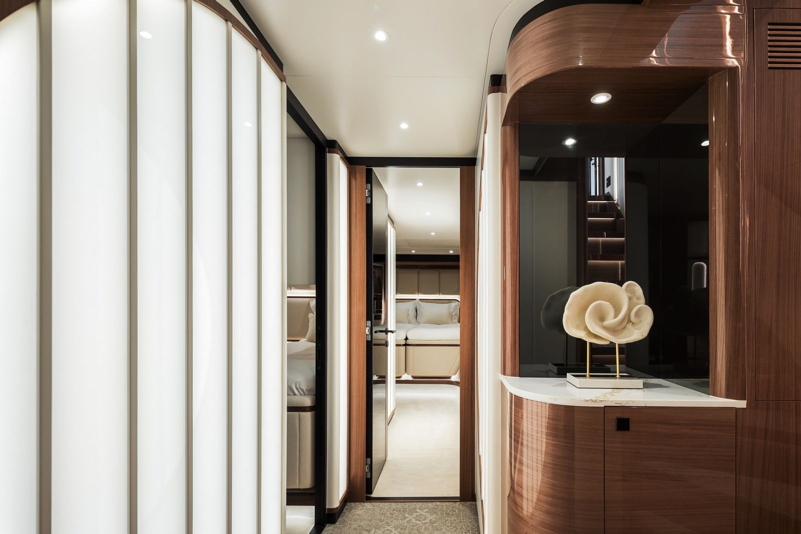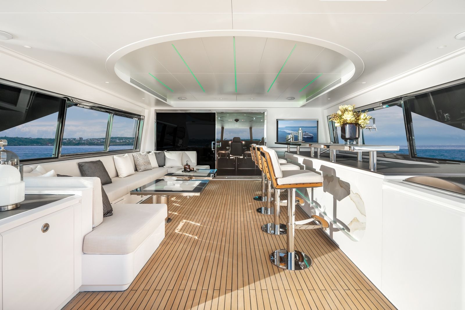 High-gloss Koto wood contrasts with matte black and white lacquer finishes, while mirrored gunmetal titanium ceiling elements and brushed stainless accents introduce a layered, modern atmosphere. The FD100 Skyline also features the first Open Galley configuration on this model, designed as a luminous, social centerpiece enhanced by indirect LED lighting and expansive floor-to-ceiling glazing.