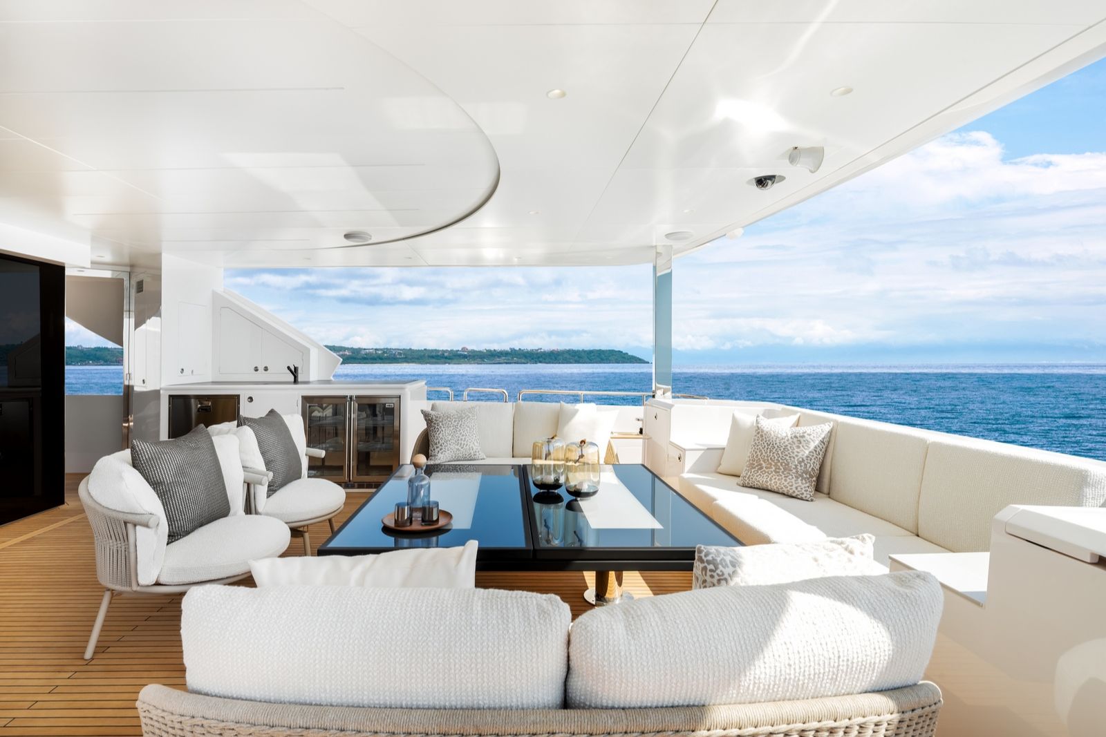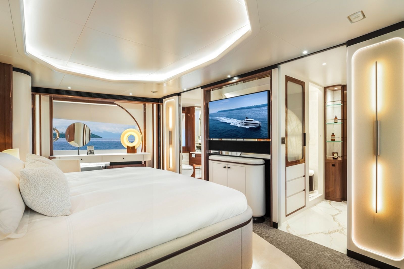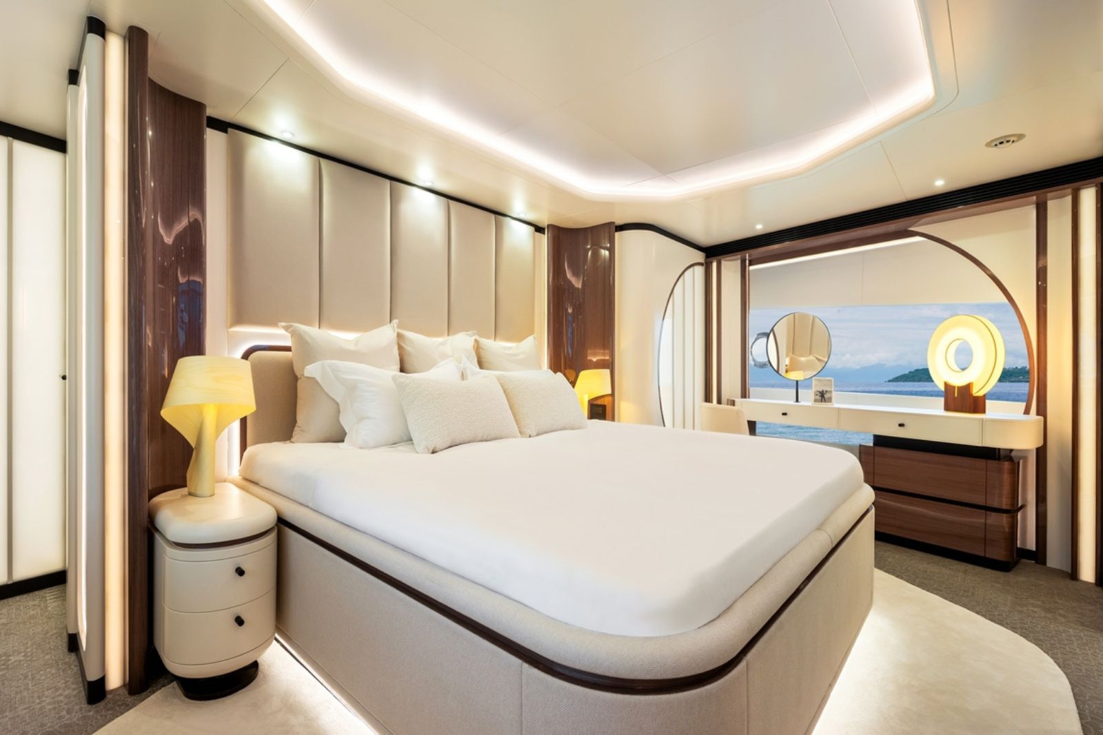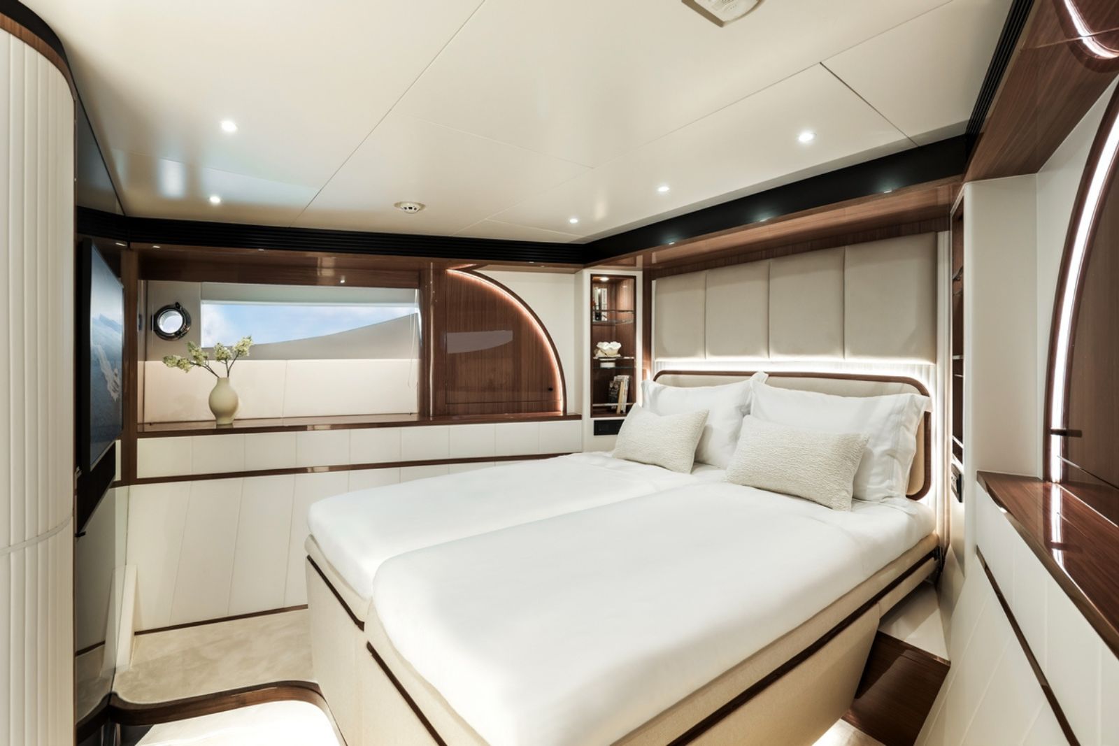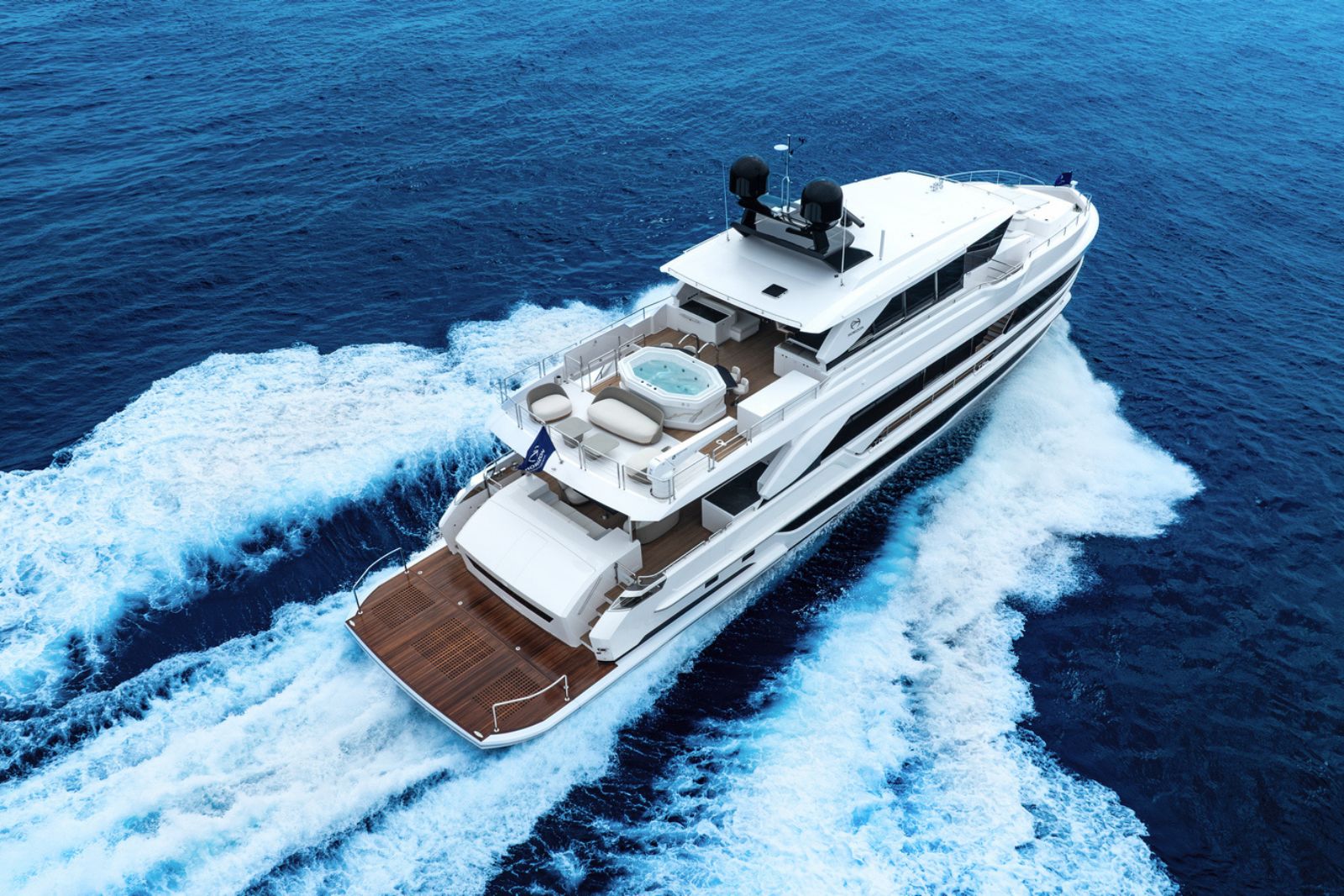 High-gloss Koto wood contrasts with matte black and white lacquer finishes, while mirrored gunmetal titanium ceiling elements and brushed stainless accents introduce a layered, modern atmosphere. The FD100 Skyline also features the first Open Galley configuration on this model, designed as a luminous, social centerpiece enhanced by indirect LED lighting and expansive floor-to-ceiling glazing.