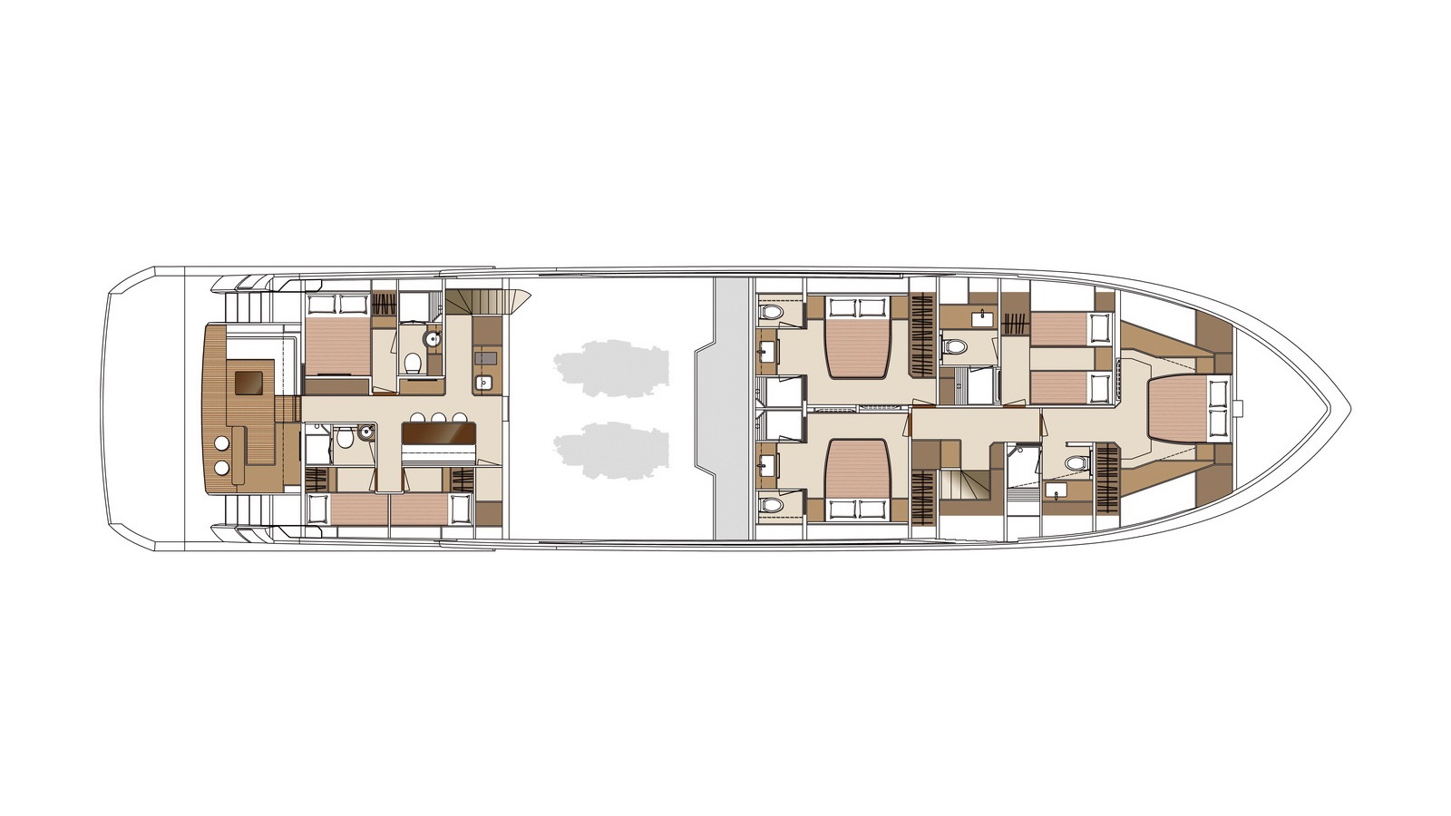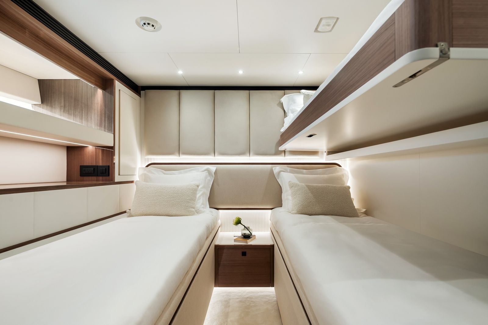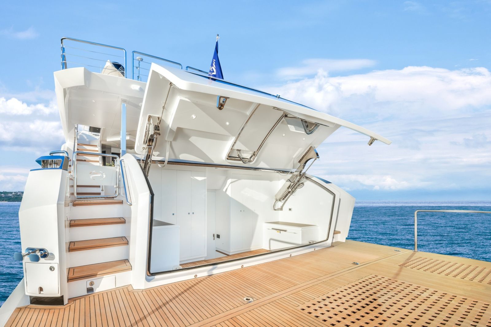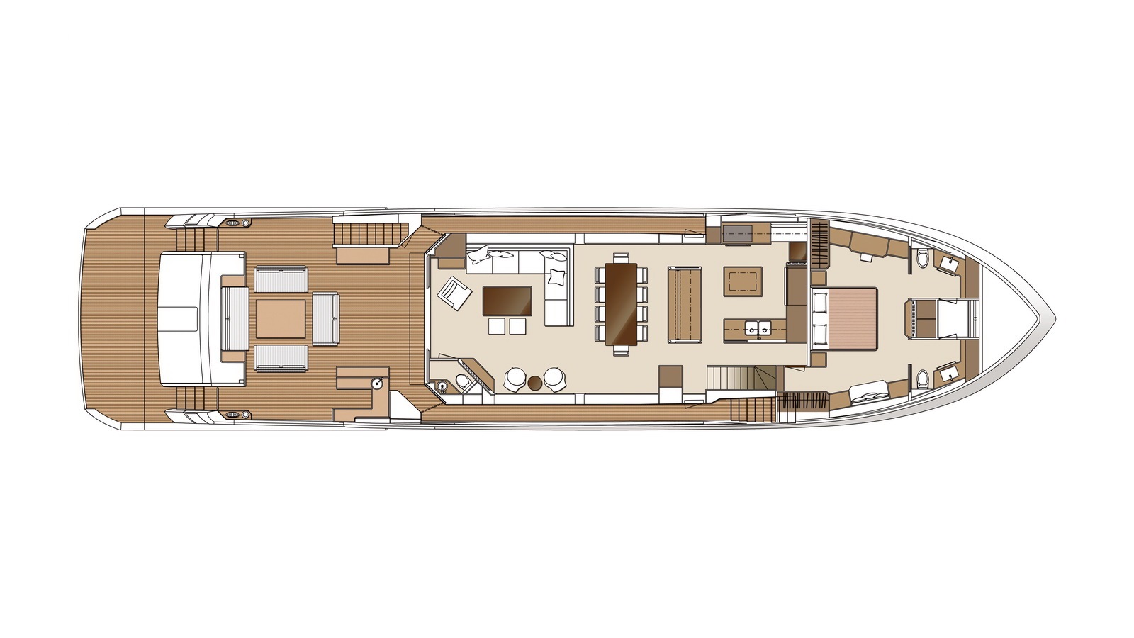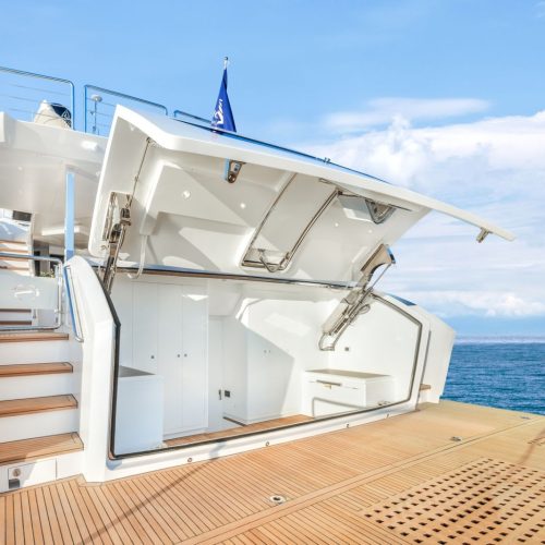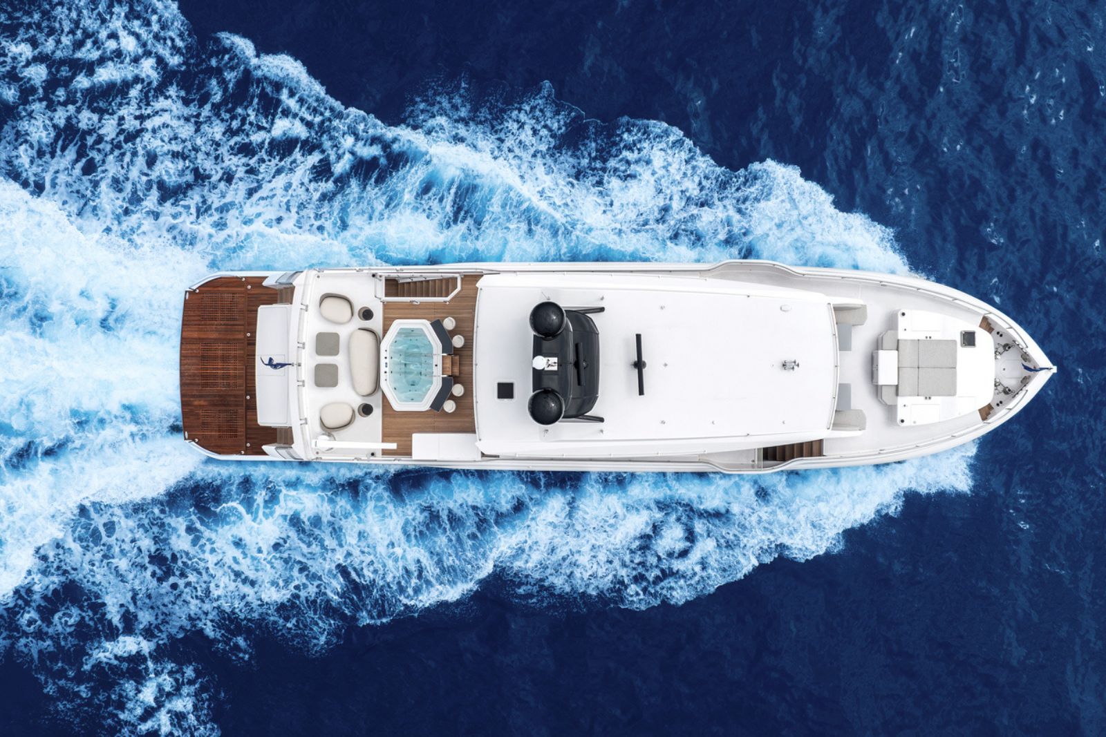 High-gloss Koto wood contrasts with matte black and white lacquer finishes, while mirrored gunmetal titanium ceiling elements and brushed stainless accents introduce a layered, modern atmosphere. The FD100 Skyline also features the first Open Galley configuration on this model, designed as a luminous, social centerpiece enhanced by indirect LED lighting and expansive floor-to-ceiling glazing.