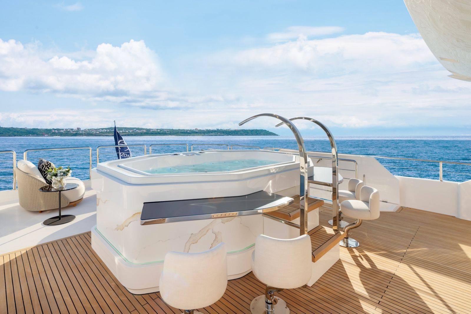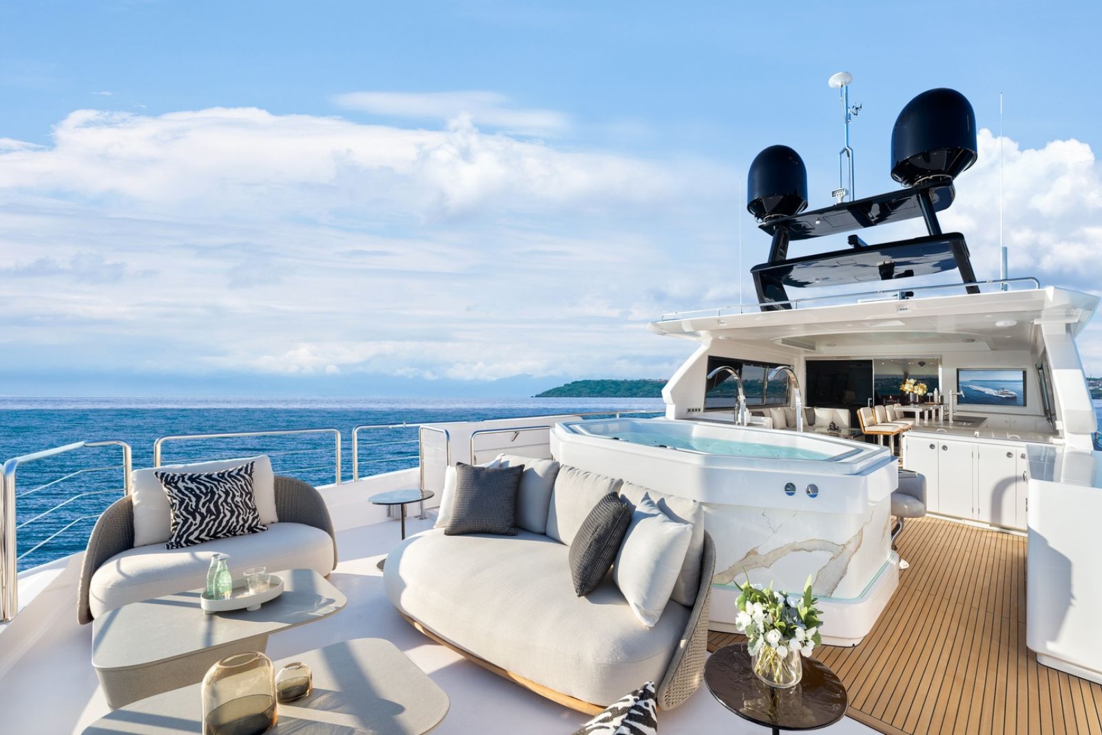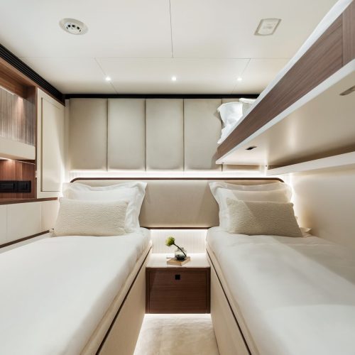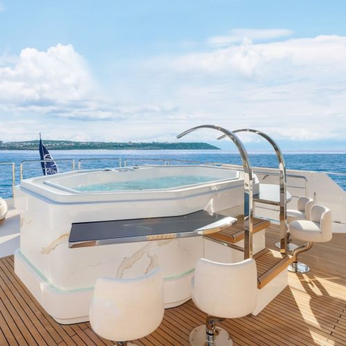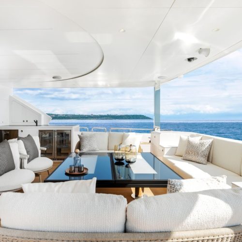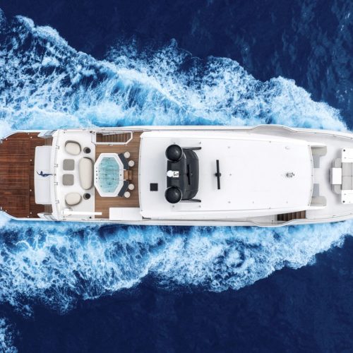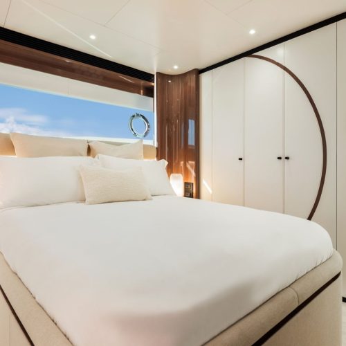 Outdoor living is elevated by a split-use Skylounge and expansive bridge deck designed for entertaining, complete with integrated culinary features and a heated Jacuzzi environment. Powered by twin MAN engines and stabilized for comfort, the FD100 Skyline delivers smooth, efficient cruising with the confidence expected from Horizon’s Fast Displacement platform.