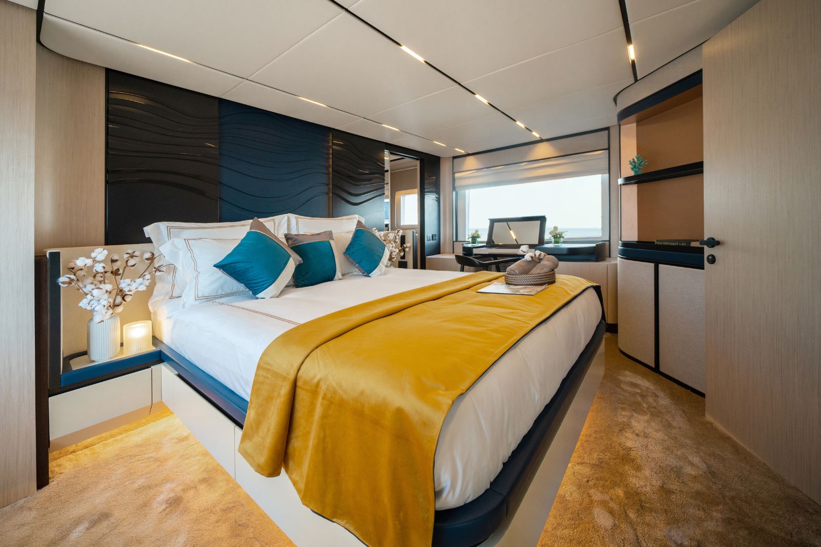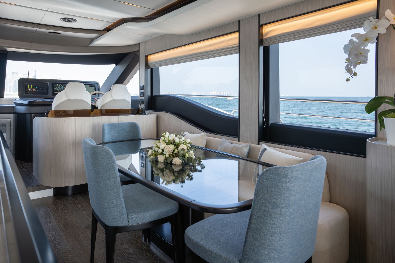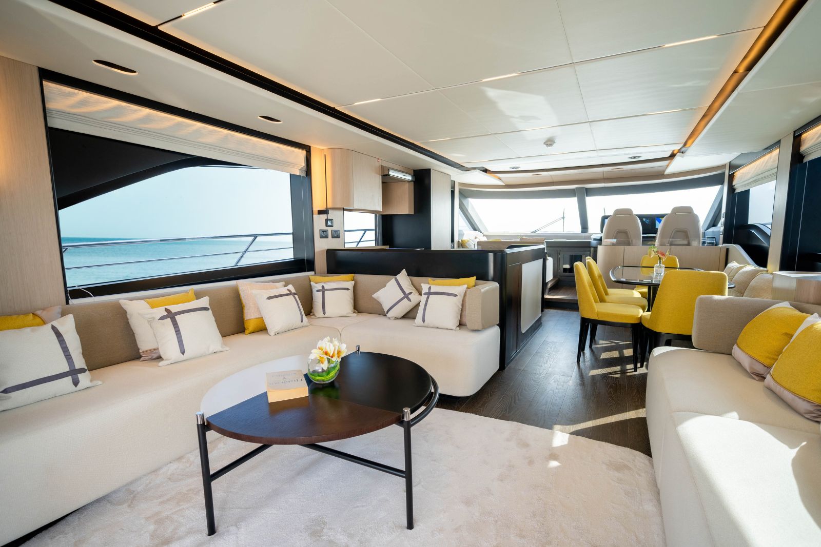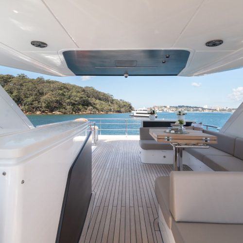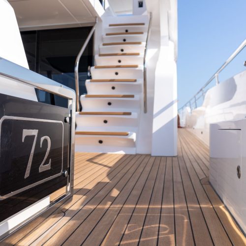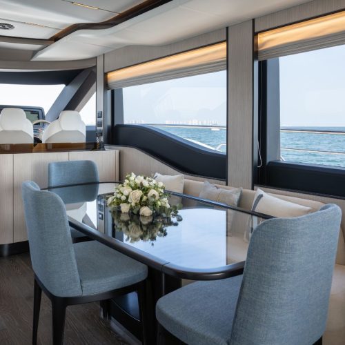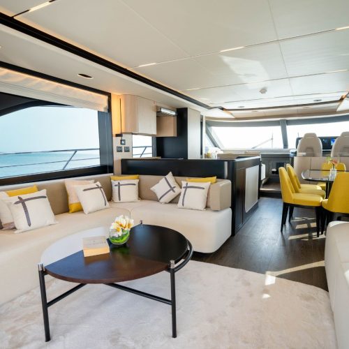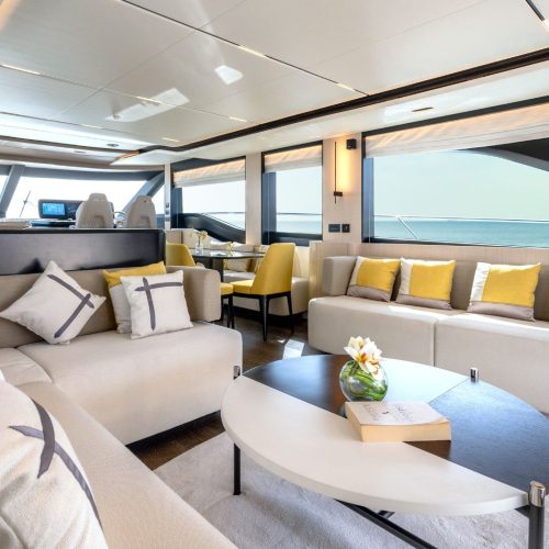 The Majesty 72 delivers an exceptional sense of space, highlighted by an impressive beam that rivals much larger yachts. Her open-plan layout creates seamless indoor–outdoor living, enhanced by panoramic windows and uninterrupted ocean views, resulting in a light-filled, fluid environment across every deck.