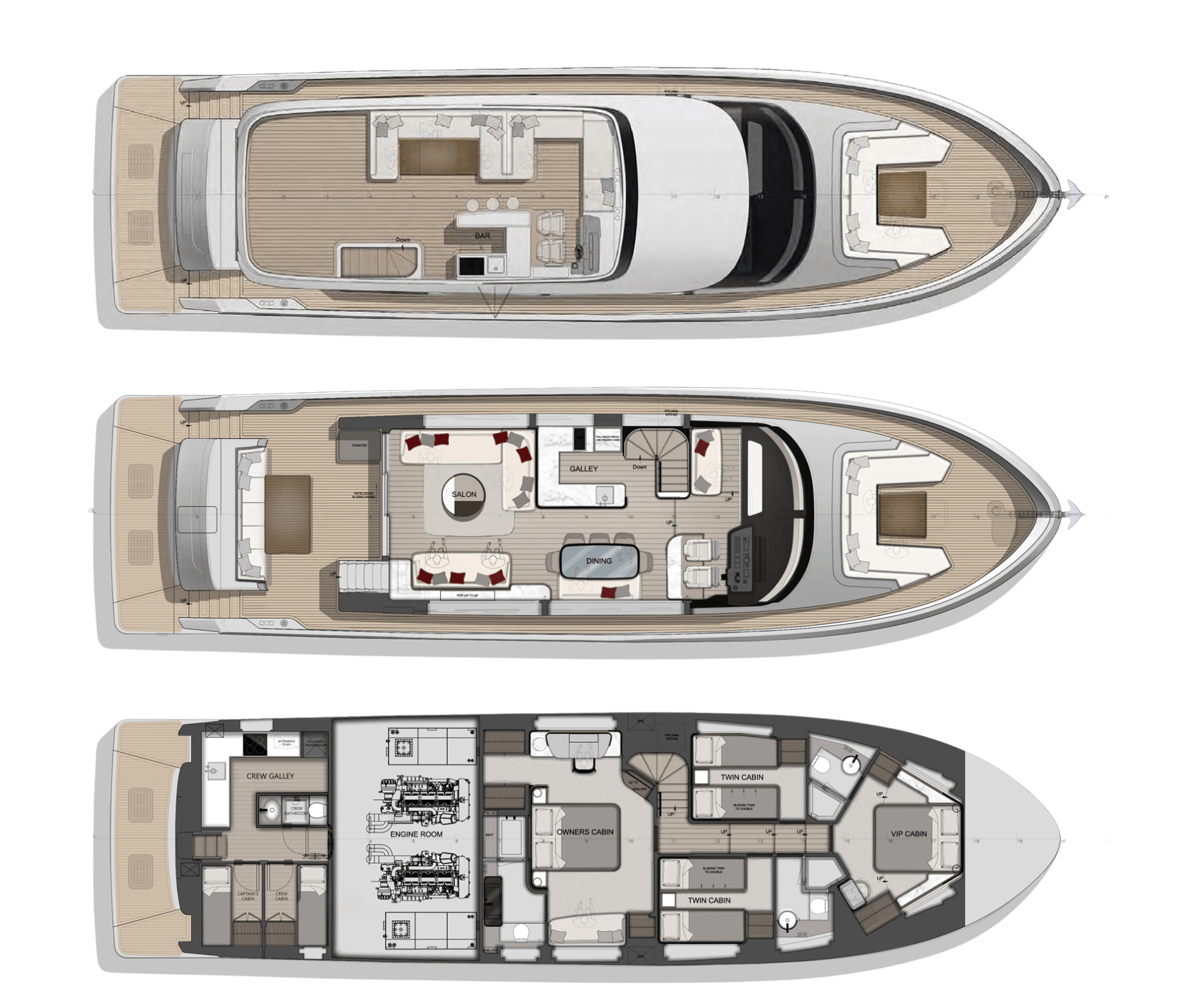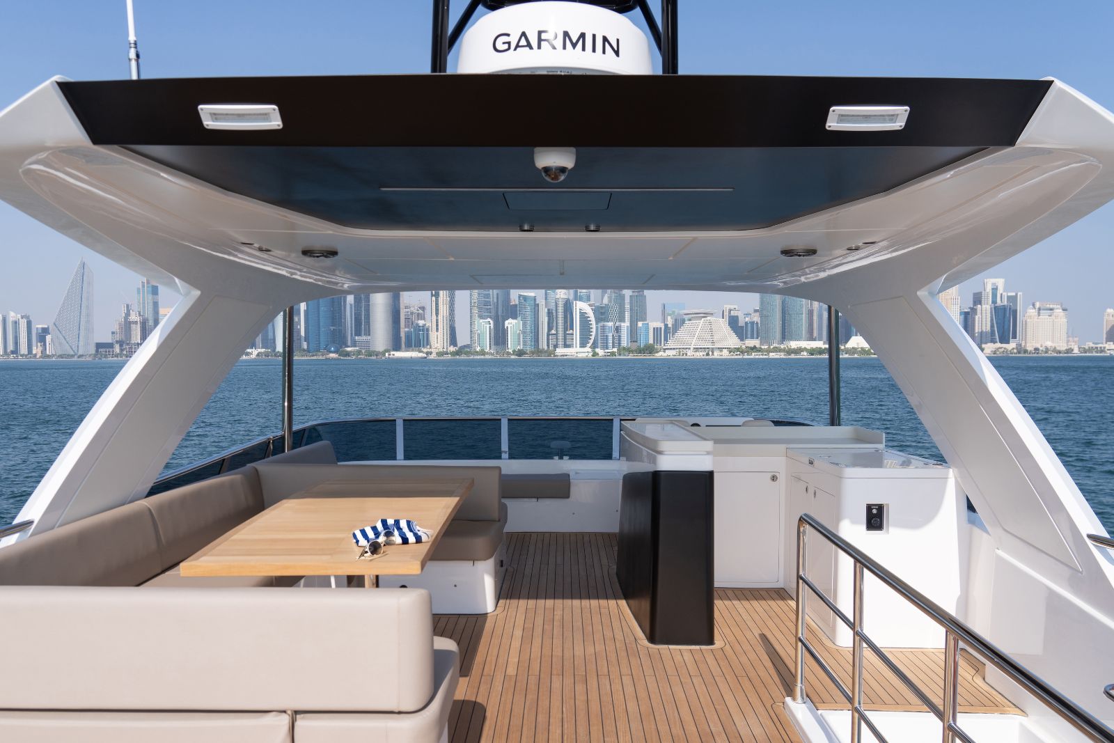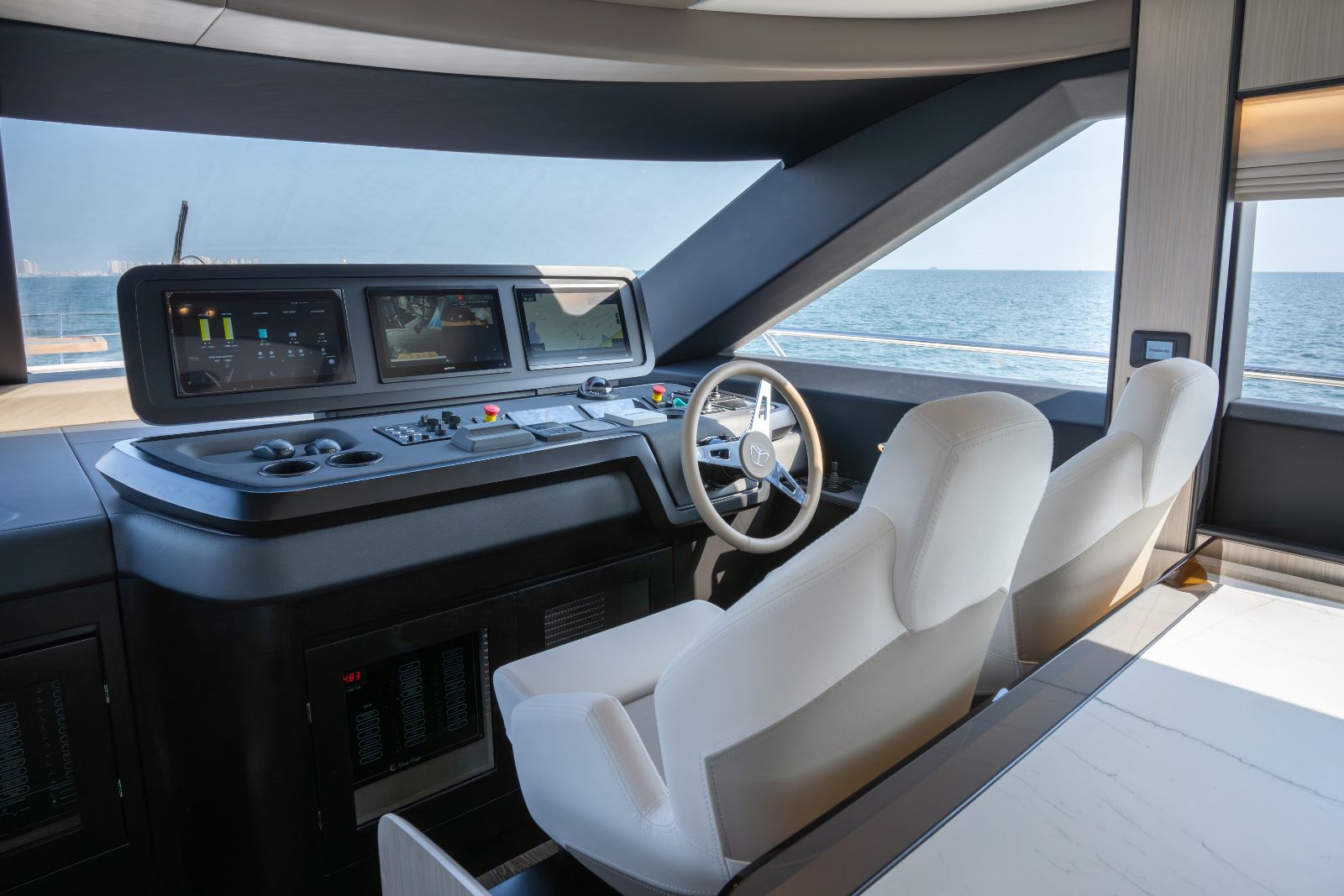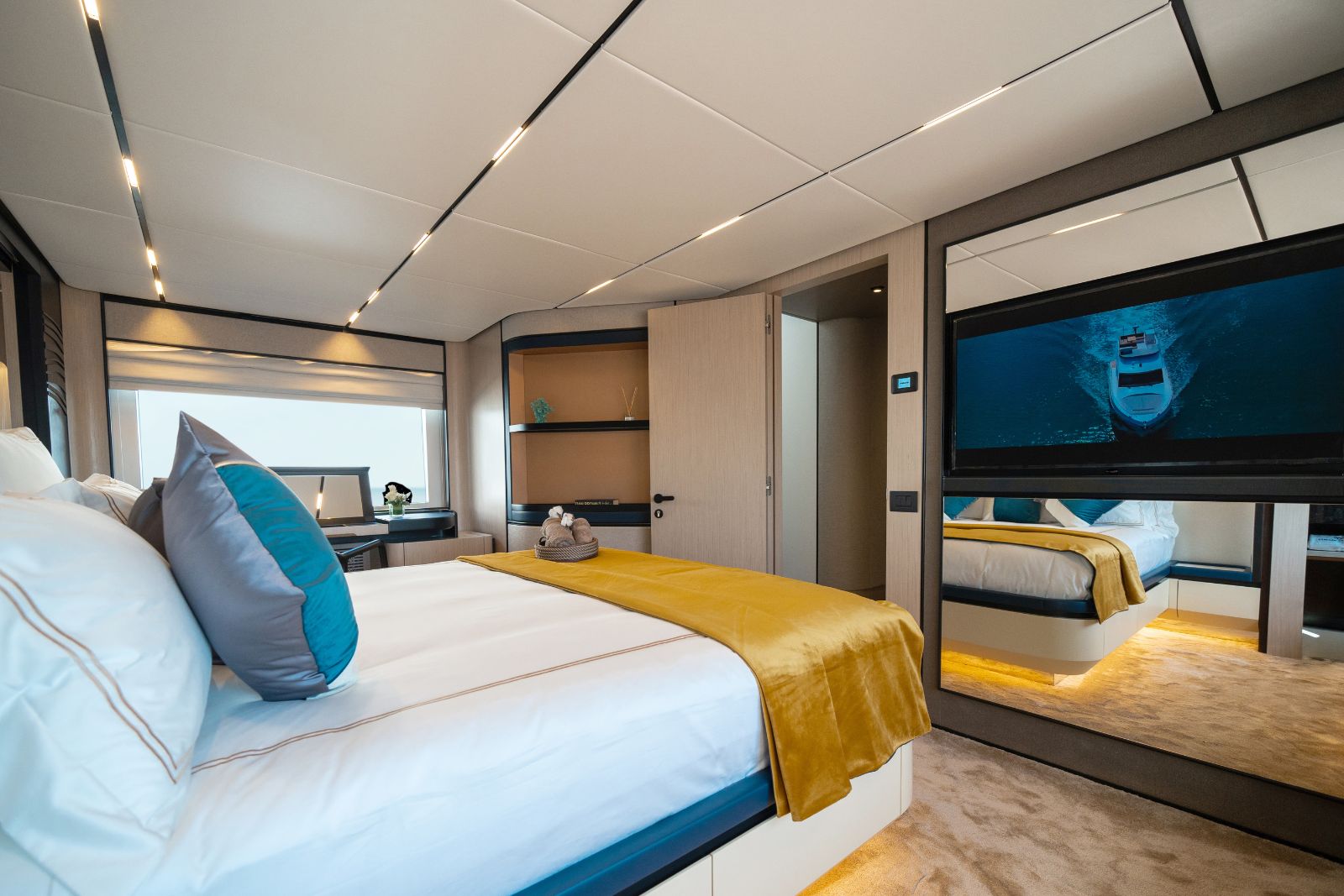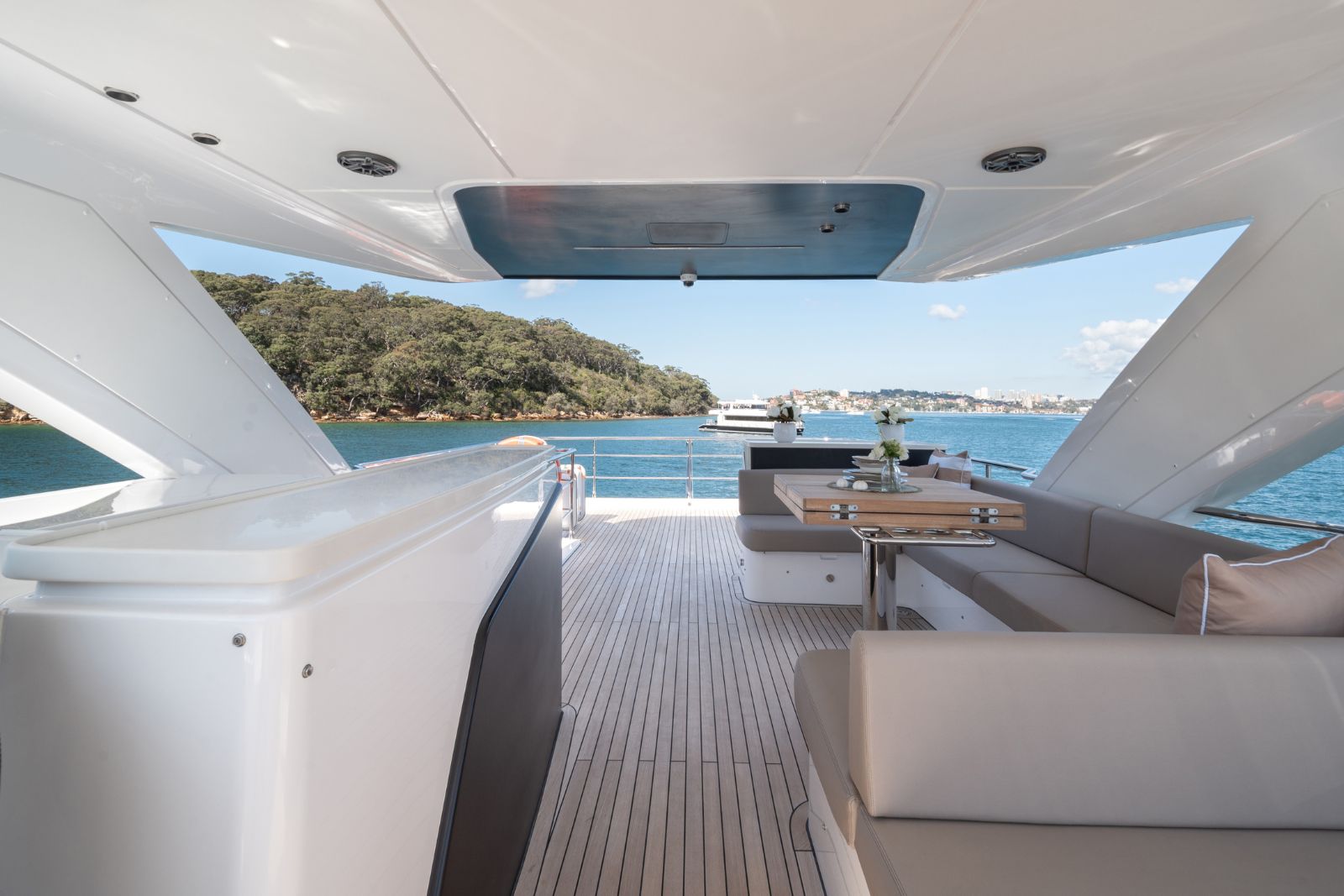 The Majesty 72 delivers an exceptional sense of space, highlighted by an impressive beam that rivals much larger yachts. Her open-plan layout creates seamless indoor–outdoor living, enhanced by panoramic windows and uninterrupted ocean views, resulting in a light-filled, fluid environment across every deck.
