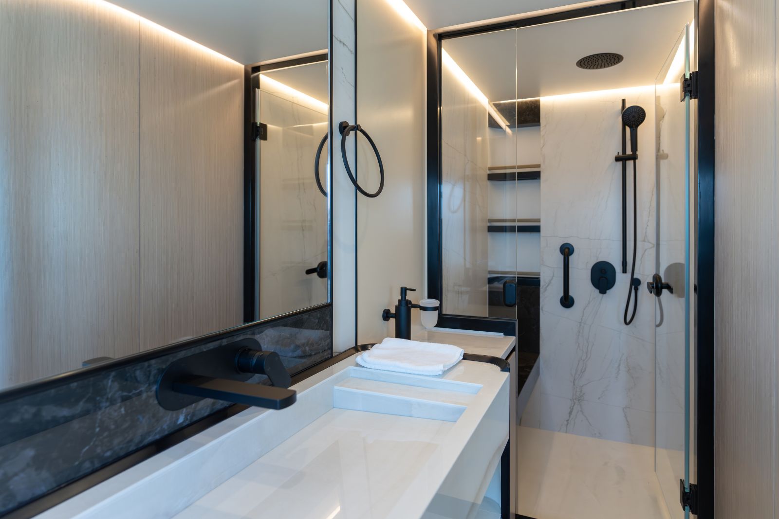 Onboard amenities are thoughtfully integrated to elevate the experience at sea, including a Hylo swim platform with ladder, high-end Miele appliances, advanced entertainment systems, intelligent lighting, and energy-efficient technologies. Every element is designed to enhance comfort, usability, and enjoyment underway or at anchor.
