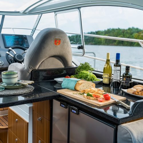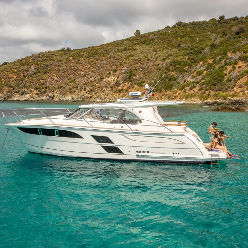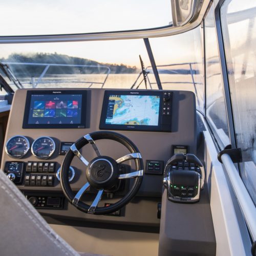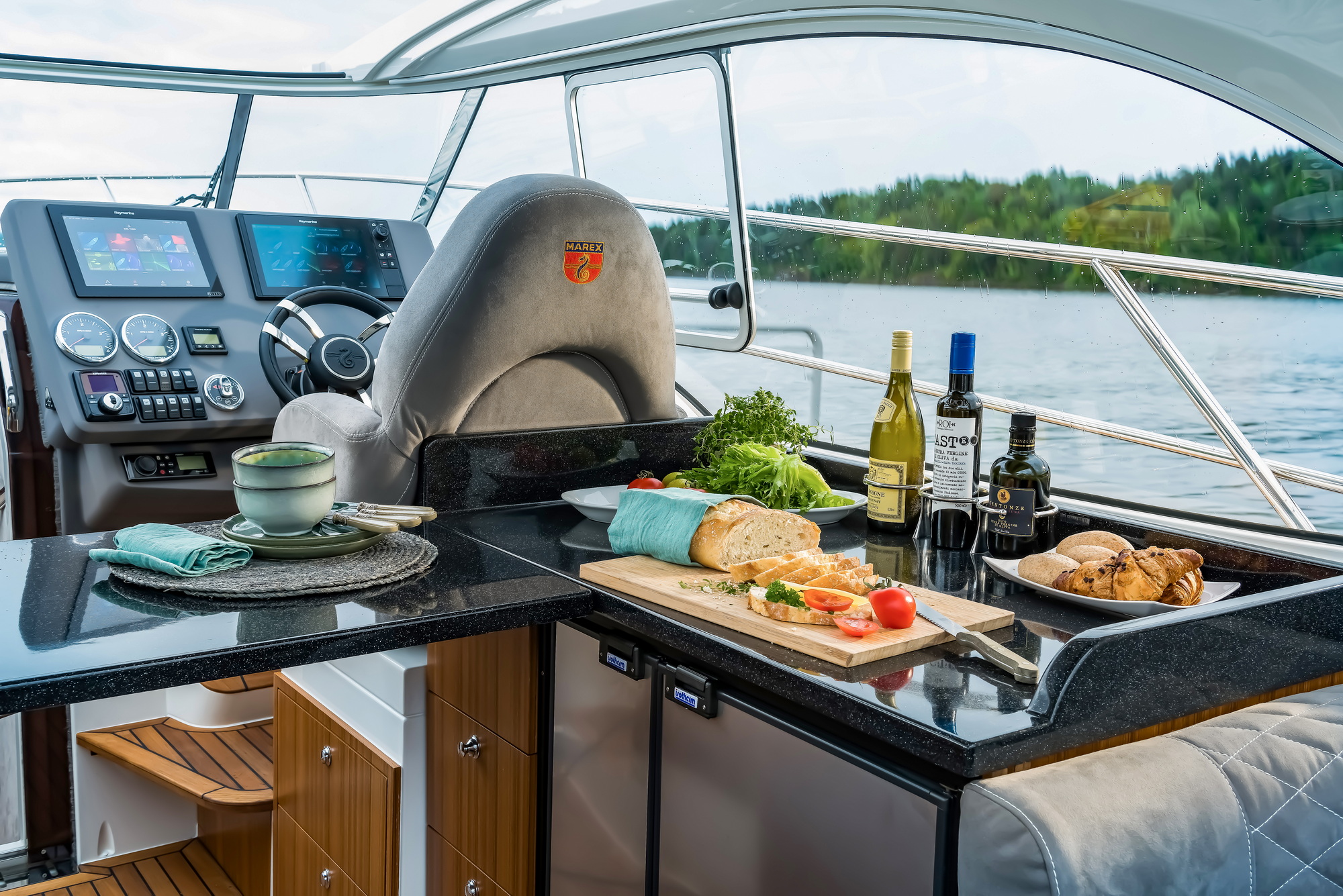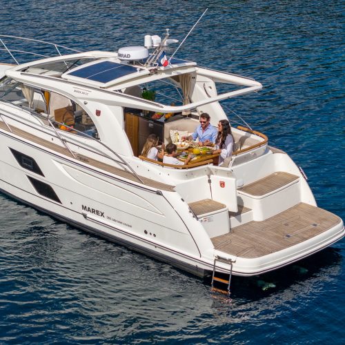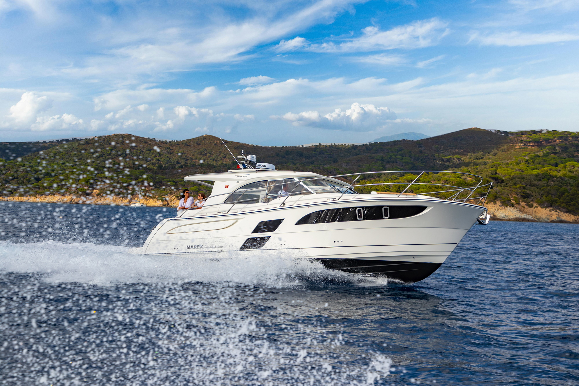 Built on a proven Marex hull and powered by Volvo Penta sterndrives, the 360 Cabriolet Cruiser delivers a smooth, quiet, and confident ride. With speeds approaching 38 knots and an efficient cruising range of over 200 nautical miles, it’s ideal for day boating or extended coastal cruising. Deep side decks, a protected helm, and premium materials make it safe, easy, and rewarding to operate in all conditions.