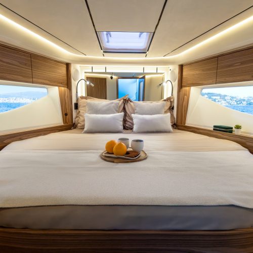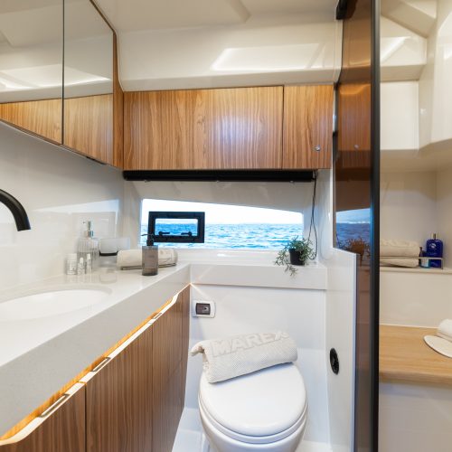 With two bright double cabins and a generous bathroom, the Marex 390 offers comfort well beyond its size. The full-beam midship cabin can feature a sofa or twin singles, while the forward owner’s cabin provides privacy and space. Perfectly balanced for couples or small families on extended cruises.