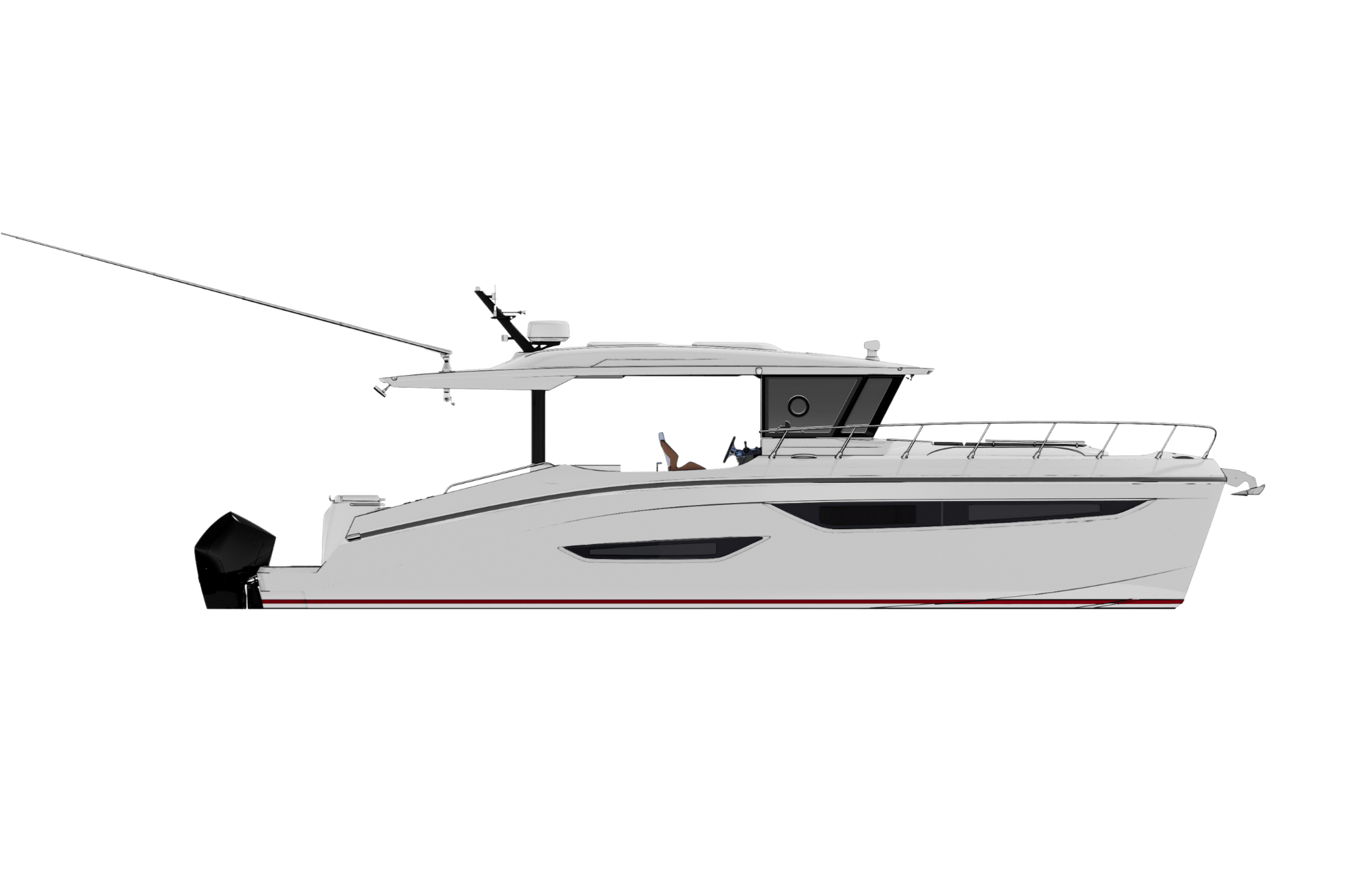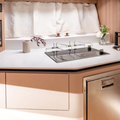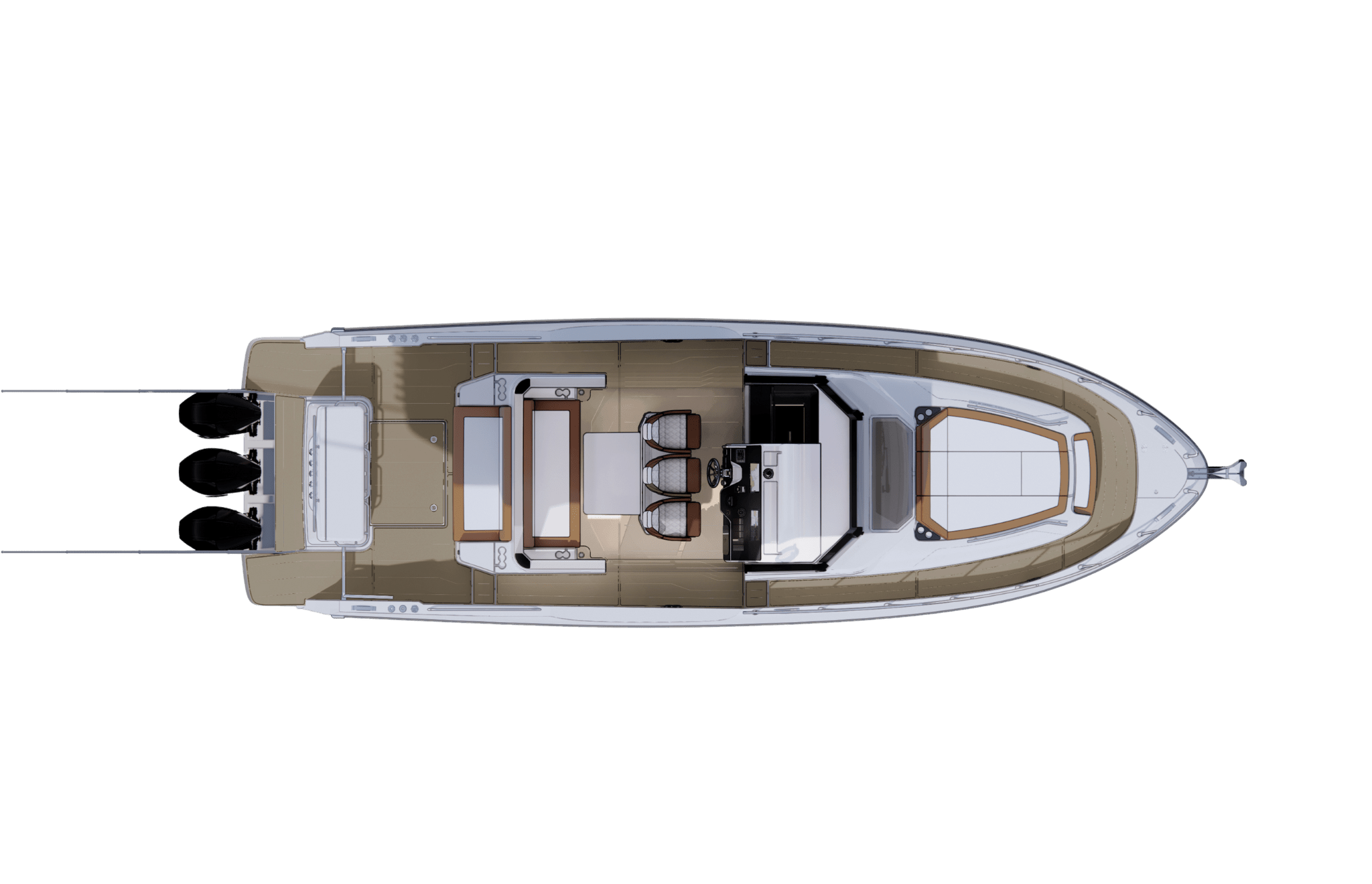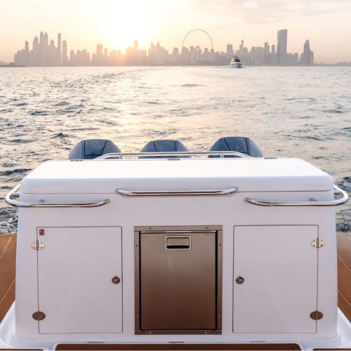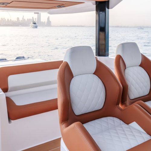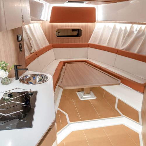 Below deck, an open and intelligently designed cabin features an integrated galley alongside a flexible dining and sleeping arrangement. This space adds real usability to the 37FX, making it perfectly suited for extended day trips or relaxed overnight stays without compromising the boat’s open, sporty character.